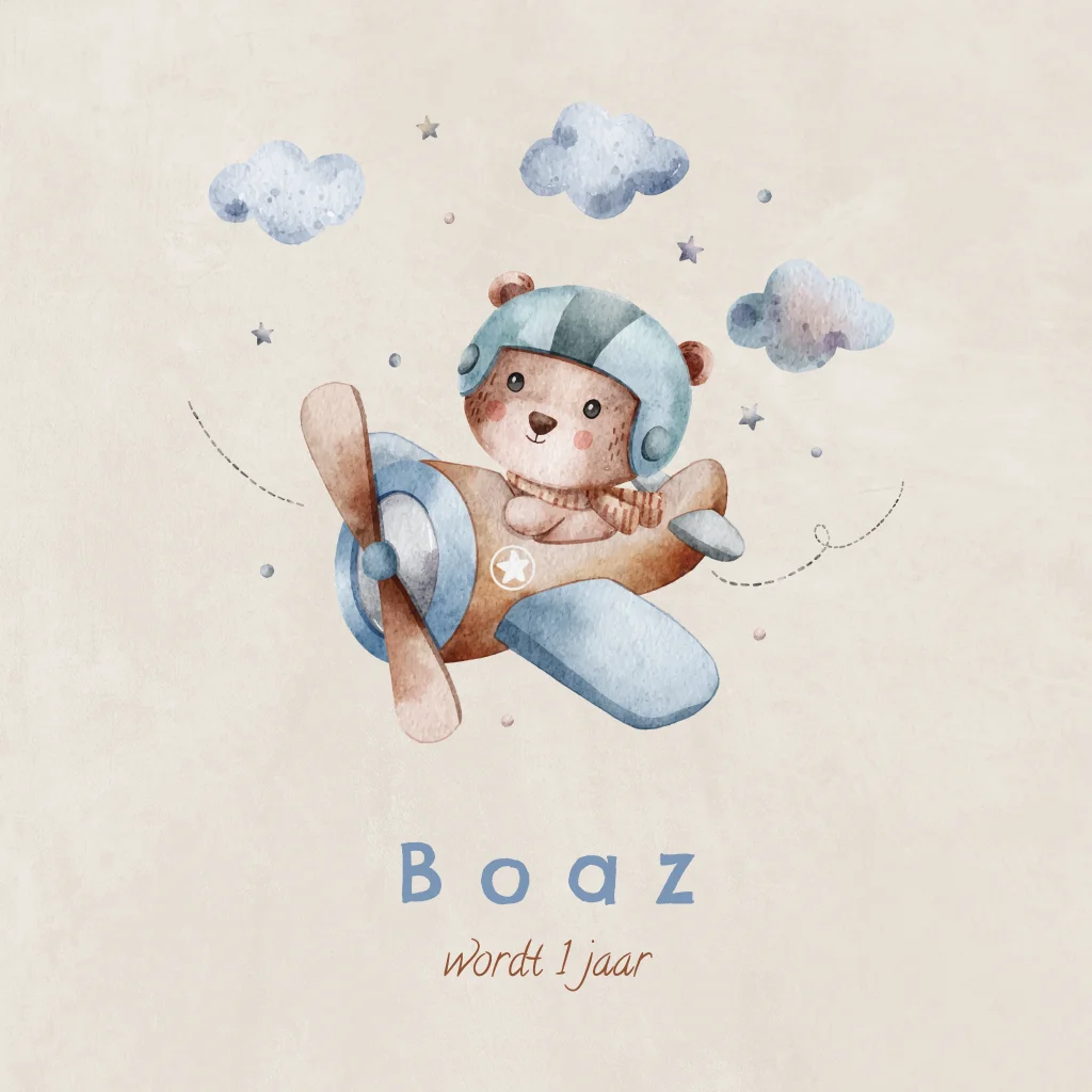 Is jouw kindje binnenkort jarig? Kondig zijn of haar verjaardag aan met dit lieve kaartje met een waterverf beertje in een vliegtuigje! Een lieve uitnodiging, zeker voor de eerste of tweede verjaardag van een kleine dreumes! De wolkjes komen terug op de achterkant van deze uitnodiging. Pas deze kaart zelf aan in onze ontwerptool.