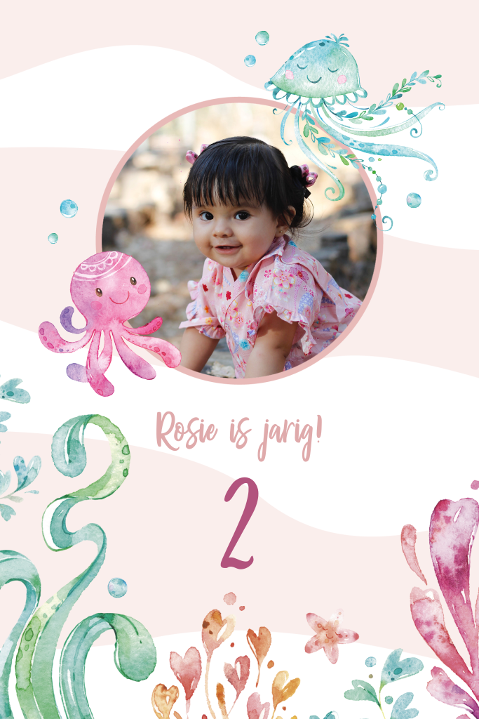 Ben jij op zoek naar een te gekke uitnodiging voor je dochters verjaardagsfeestje. Houdt ze van onderwaterdieren? Dan is deze uitnodiging helemaal voor haar. Op de voorkant is ruimte voor een foto van je prachtige dochter en aan de onderkant van de uitnodiging zie je verschillende waterplantjes, hierdoor lijkt het net alsof je je echt diep in de zee bevindt. De zeediertjes zoals kwalletjes en zeepaardje maken het af.