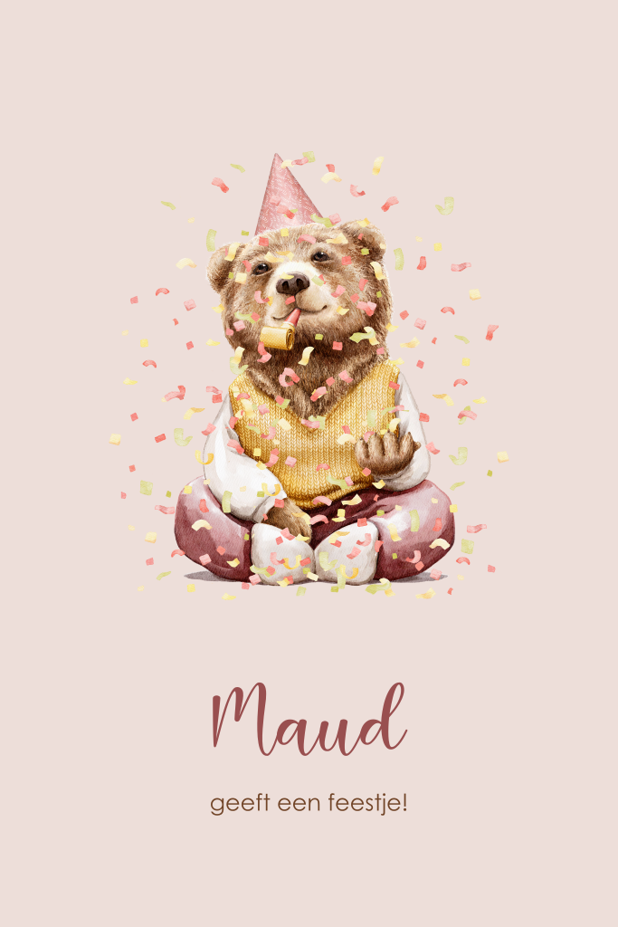 Is je dochter binnenkort jarig en ben je van plan een feestje te geven? Stuur dan deze leuke, beige uitnodiging rond onder je gasten, met een vrolijke beer die een feestelijke muts draagt en omringd is door confetti. Je kunt de verjaardagskaart eenvoudig personaliseren met behulp van onze editor.