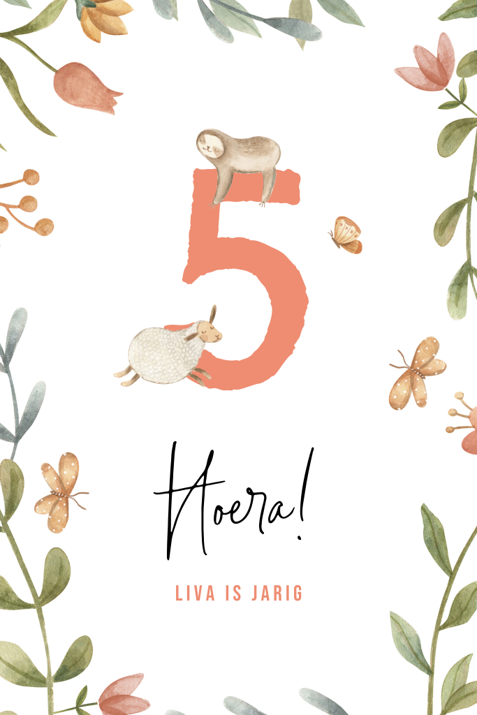 Uitnodiging kinderfeestje met gekleurde bloemen, een roze cijfer en vrolijke diertjes. Is jouw dochter binnenkort jarig en ben je op zoek naar een leuke uitnodiging voor haar feestje? Dit speelse ontwerp is misschien wel de kaart voor jou! De kaart heeft een omlijsting van gekleurde bloemen en bladeren. In het midden staat de leeftijd van je dochter met een groot cijfer. Deze kaart is extra leuk door de speelse tekeningen van de diertjes.
