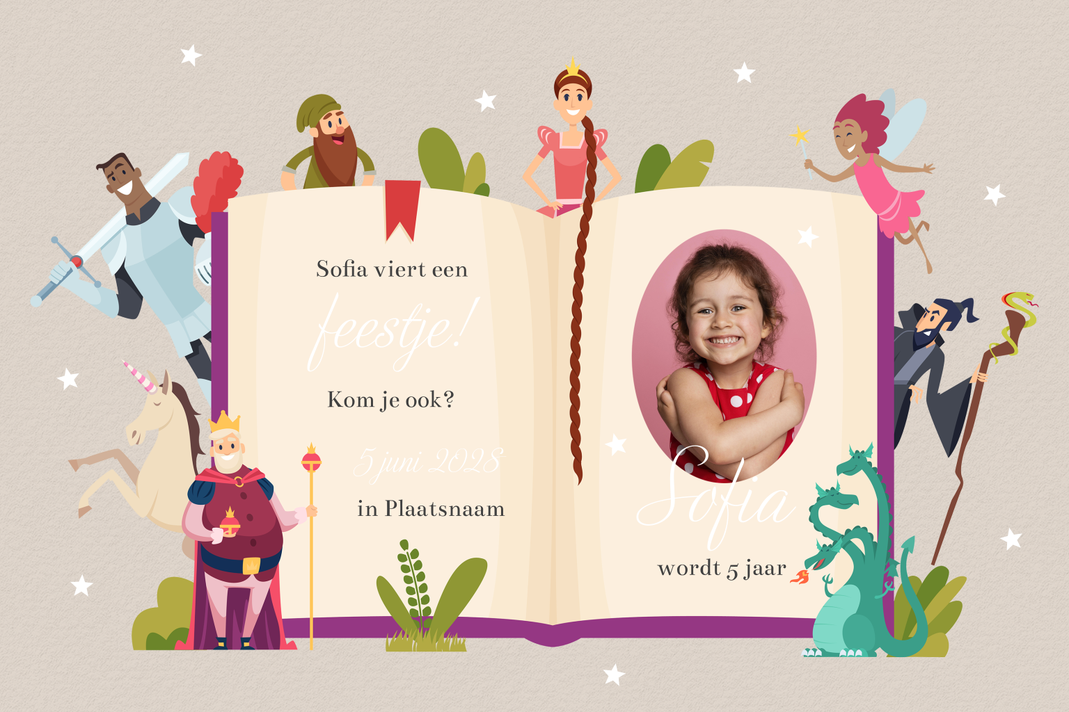 Uitnodiging kinderfeestje met sprookjesboek en foto