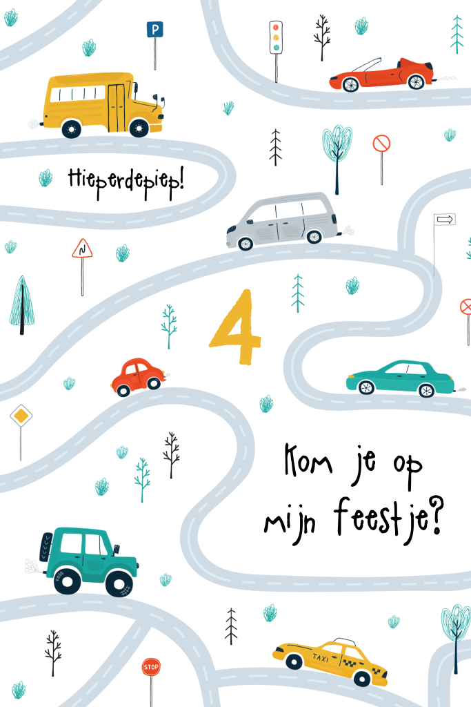 Viert jouw kleine binnenkort zijn of haar verjaardagsfeestje? Nodig iedereen uit met deze vrolijke uitnodiging met auto's, bussen en weggetjes! Perfect voor kinderen die dol zijn op alles met wielen. Pas dit kaartje zelf aan in onze editor.