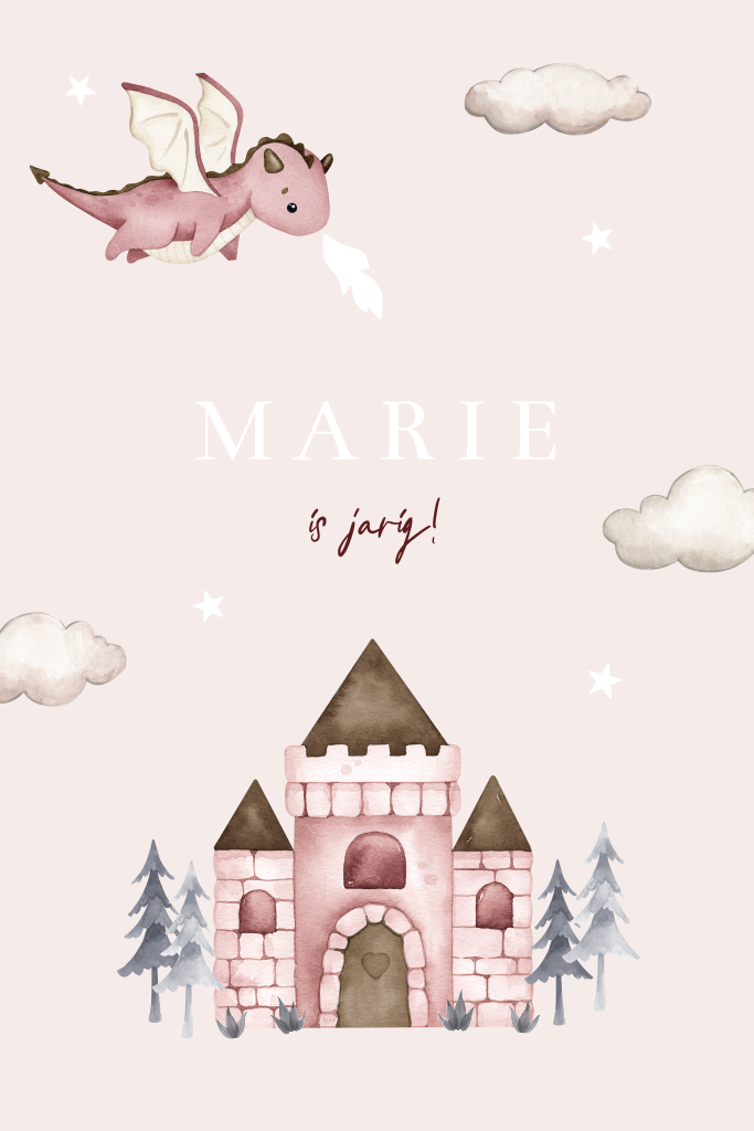 Is de verjaardag van jouw dochter in aantocht en ben je een kinderfeestje aan het organiseren? Verstuur dit lieve kaartje met een vriendelijke draak en een kasteel om alle vriendjes en vriendinnetjes uit te nodigen. Het roségouden accent wordt gedrukt met echte folie! Maak gebruik van onze ontwerptool om het kaartje volledig naar wens aan te passen, bijvoorbeeld door een ander lettertype of achtergrondkleur te kiezen.