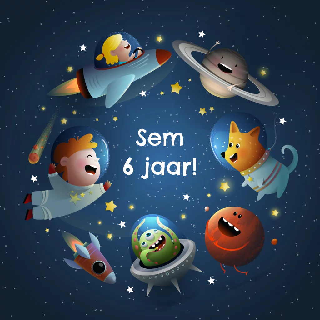 Is jouw zoon of dochter jarig binnenkort en vieren jullie een kinderfeestje met ruimte thema? Nodig alle vriendjes en vriendinnetjes uit met dit leuke kaartje met goudfolie naam en sterretjes, raket en astronautjes. Op de voorkant wordt de naam van je kind en de leeftijd plus een aantal sterretjes in glimmend goudfolie gedrukt. Op de achterkant is ruimte voor informatie over het feestje.