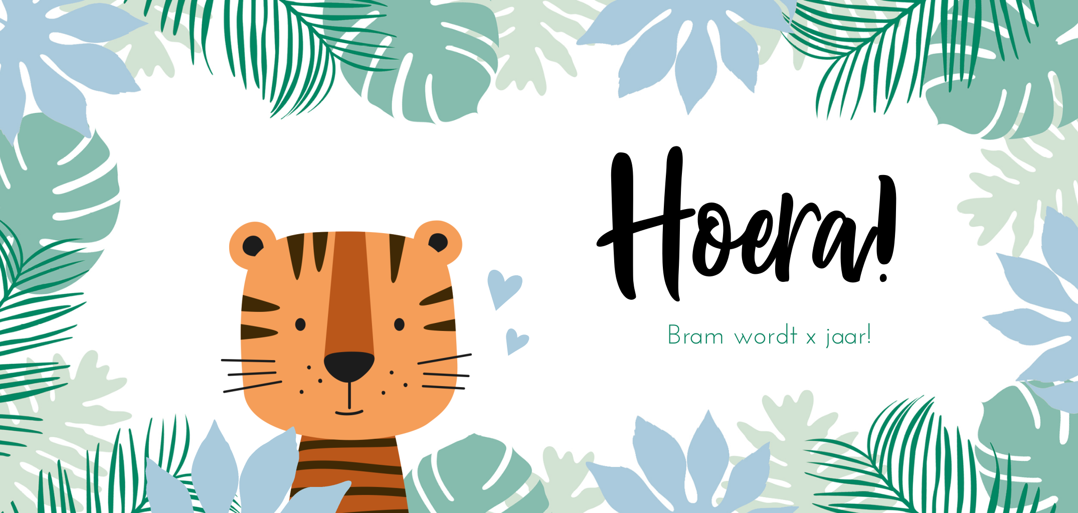 Een vrolijke uitnodiging voor een verjaardagsfeestje van je zoontje. Op de kaart staat een getekend tijgertje met daaromheen allerlei tropische bladeren in blauw en groen. Op de achterzijde van dit enkele kaartje kun je de info kwijt over het feestje. Pas deze uitnodiging aan naar eigen smaak in onze ontwerptool.