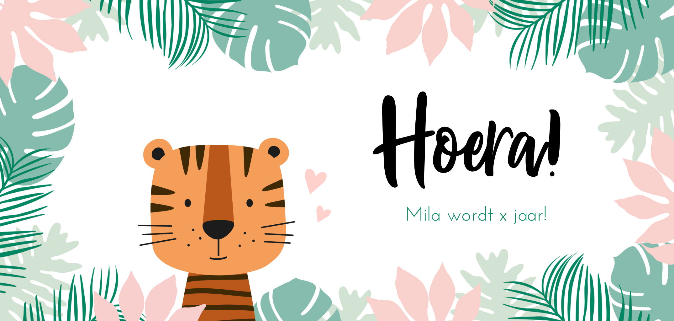 Vrolijke uitnodiging voor verjaardagsfeestje met tijgertje en tropische bladeren in groen en roze. Is je dochtertje dol op dieren en is ze bijna jarig? Deze tropische uitnodiging past goed bij een leuk verjaardagsfeestje met een jungle thema! Pas het ontwerp eventueel naar smaak aan in onze ontwerptool.