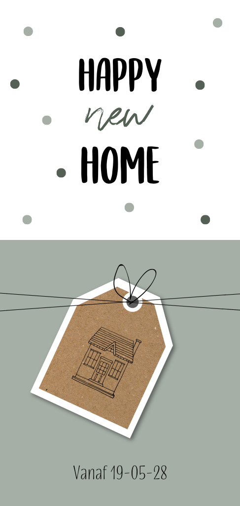 Verhuisd en een housewarming? Deze feestelijke verhuiskaart met grijsgroene confetti en getekend huisje is perfect om uw kennissenkring uit te nodigen voor een gezellig feestje. Langwerpige, enkele verhuiskaart met getekend huisje aan een labeltje, versierd met grijsgroene confetti. In speelse, afwisselende typografie staat bovenaan de kaart 'happy new home'. Op de achterzijde kunt u een leuk berichtje aan de ontvanger schrijven.
