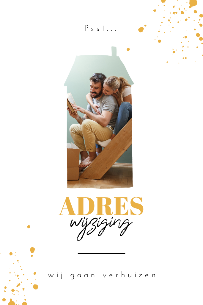 Deze speelse verhuiskaart is helemaal volgens de laatste trends, net als jouw pas ingerichte nieuwe huis! Verstuur deze trendy kaart om je adreswijziging door te geven aan vrienden en familie. De witte kaart is versierd met gouden hartjes en spetters en in het fotokader in de vorm van een huis kun je een foto kwijt. Pas het ontwerp naar wens aan.