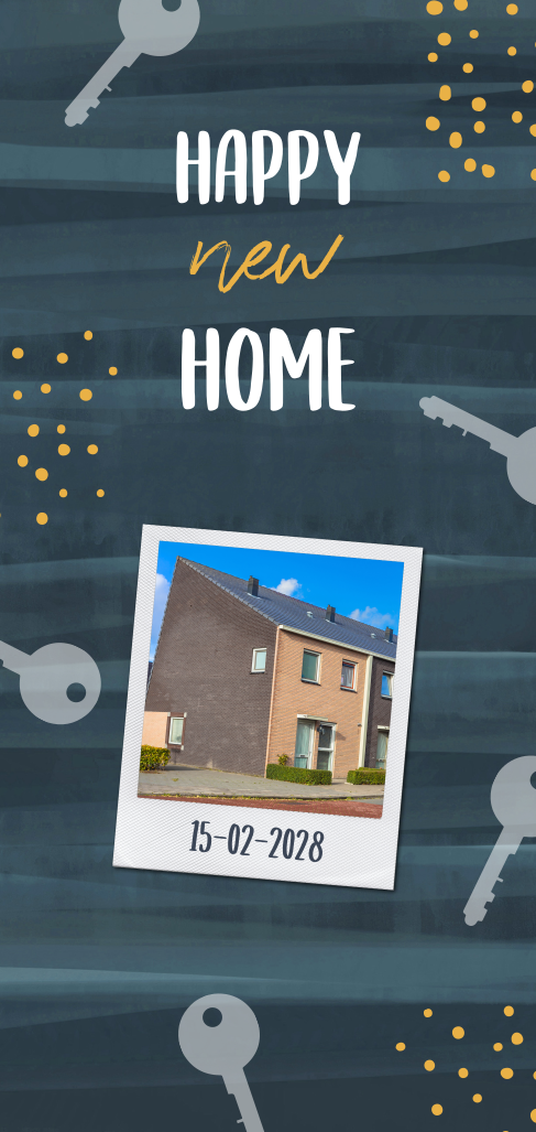 Verhuisd en een housewarming? Deze feestelijke verhuiskaart met foto van jullie nieuwe huis is perfect om je kennissenkring uit te nodigen voor een gezellig feestje. Langwerpige, enkele verhuiskaart versierd met okergele confetti en sleutels. In speelse, afwisselende typografie staat bovenaan de kaart 'happy new home'. Op de achterzijde kun je een leuk berichtje aan de ontvanger schrijven.