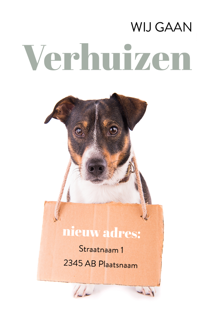 Verhuiskaart met hond met bordje met nieuw adres