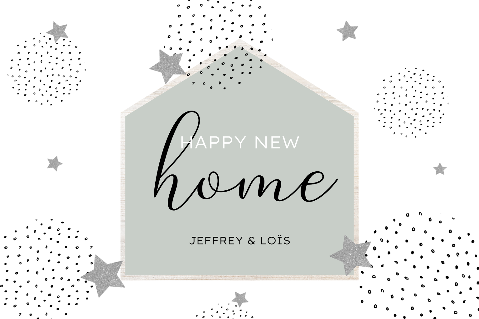 Op de verhuiskaart staat een grijsgroen huisje omringd door vrolijke, zwarte stipjes en zilveren sterren. De stippen en sterren keren terug op de achterkant van de kaart. Daar kan je ook een boodschap kwijt en natuurlijk je nieuwe adres.