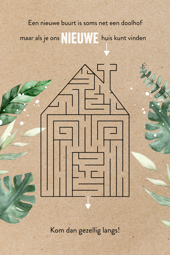 Altijd als je net bent verhuisd is het erg moeilijk om de weg in één keer te vinden. Een nieuwe buurt voelt altijd aan als een groot doolhof en alles lijkt op elkaar. Wij weten hoe het voelt en begrijpen het heel goed. Daarom hebben wij deze verhuiskaart gemaakt met een kraftlook achtergrond, tropische bladeren en een zwart doolhof in de vorm van een huisje. Alles in dit kaartje kun je zelf aanpassen in de ontwerptool.
