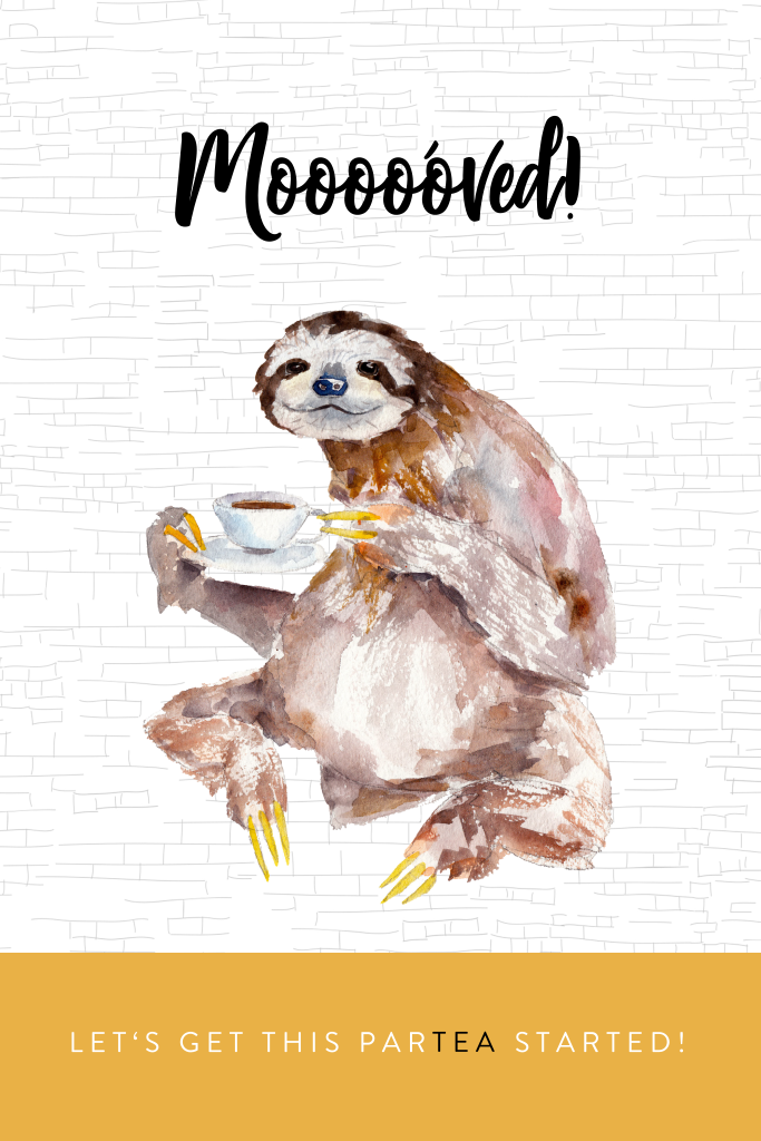 Leuke verhuiskaart met een lieve illustratie van een luiaard met een kopje thee op een getekende achtergrond van bakstenen en een gele balk. Op de voorkant staat de tekst 'Let's get this parTEA started!'. Op de achterkant kun je een kort berichtje schrijven en de ontvanger op de hoogte stellen van je nieuwe adres.