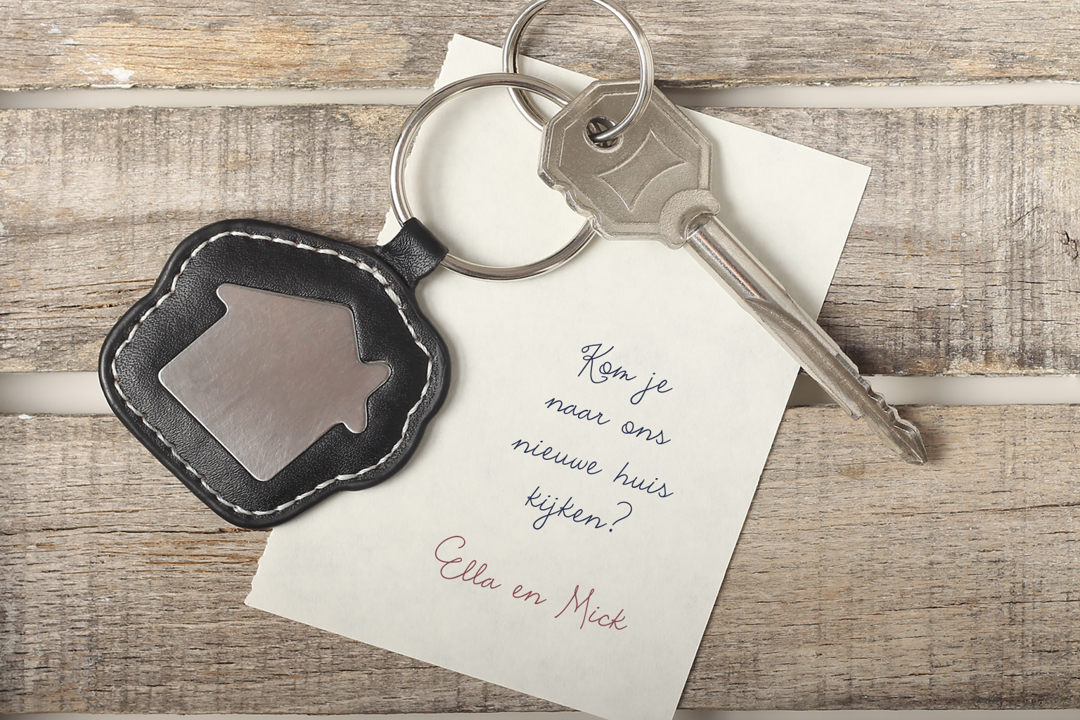 Je loopt je huis uit, doet de deur dicht en terwijl je wegloopt bedenk je je dat de sleutels nog binnen liggen. Jezelf buiten gesloten. Herkenbaar? Nou, wij kennen het in ieder geval zeker wel! Met deze verhuiskaart met een foto van een sleutel laat je iedereen weten dat je verhuisd bent en dat je je sleutels dan maar beter niet kunt vergeten!