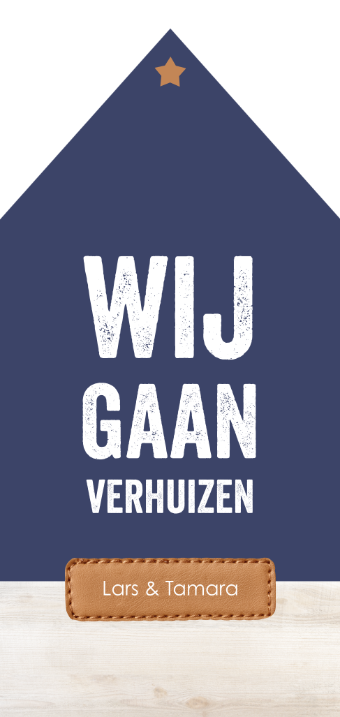 Deze langwerpige verhuiskaart is met zijn donkerblauwe kleur en leren labeltje helemaal in de mode. Op de voorkant staat met grote, robuuste letters 'wij gaan verhuizen'. Is dit niet helemaal jullie stijl? Pas het dan gemakkelijk aan in onze design tool naar een lettertype wat jullie wel mooi vinden. Ook de kleuren kan je aanpassen, zodat het helemaal bij jullie past.