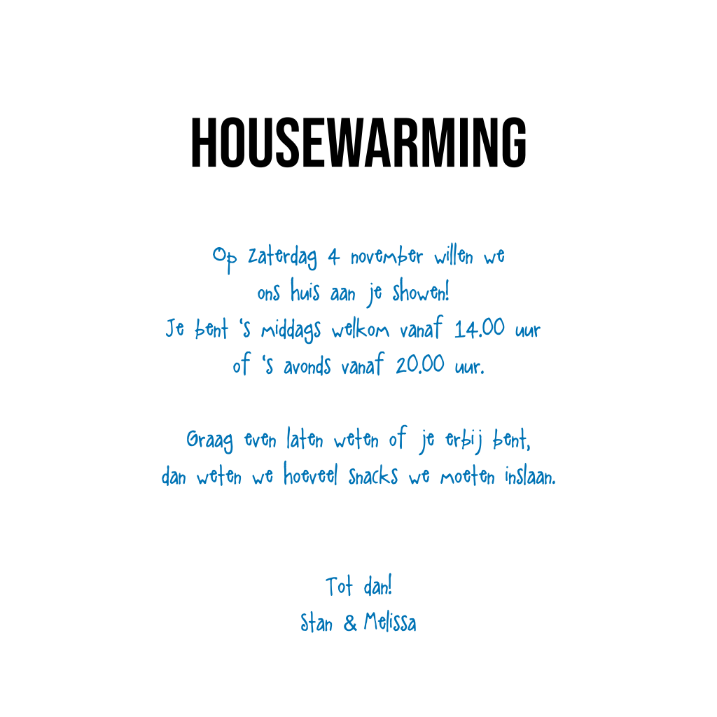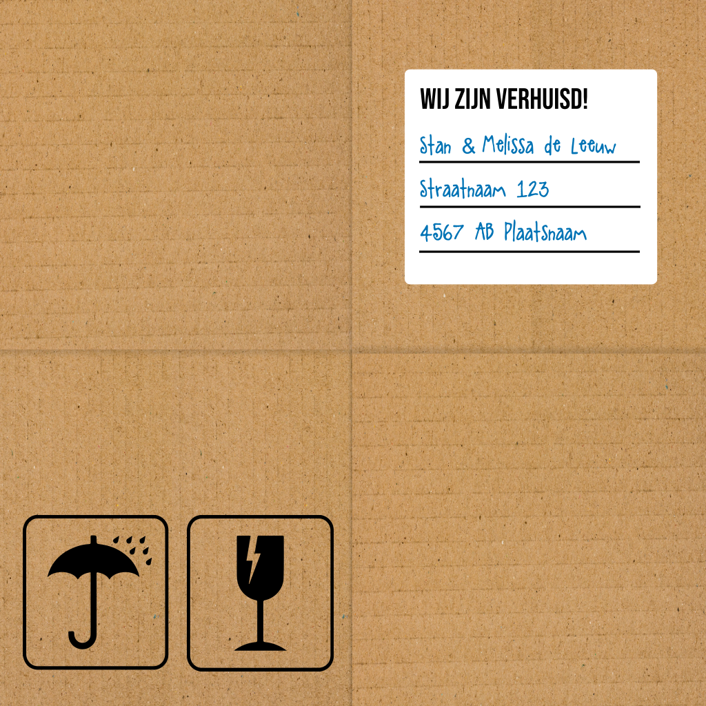 Deze originele verhuiskaart ziet er uit als een verhuisdoos. De voorkant is voorzien van een adreslabel en de welbekende iconen die je op verhuisdozen ziet. Aan de binnenkant is ruimte voor eigen tekst een een foto van jullie nieuwe stulpje. Pas de kaart naar wens aan en bestel een proefdruk.