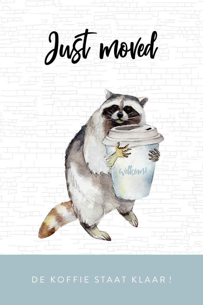 Ben je verhuisd, maar heb je je huis nog aan niemand laten zien? Dit schattige kaartje heeft een leuke illustratie van een wasbeer met een beker koffie op de voorkant. Onder de wasbeer staat met strakke letters: 'De koffie staat klaar!'. Zo laat je op een leuke manier je kennissenkring weten dat ze welkom zijn.
