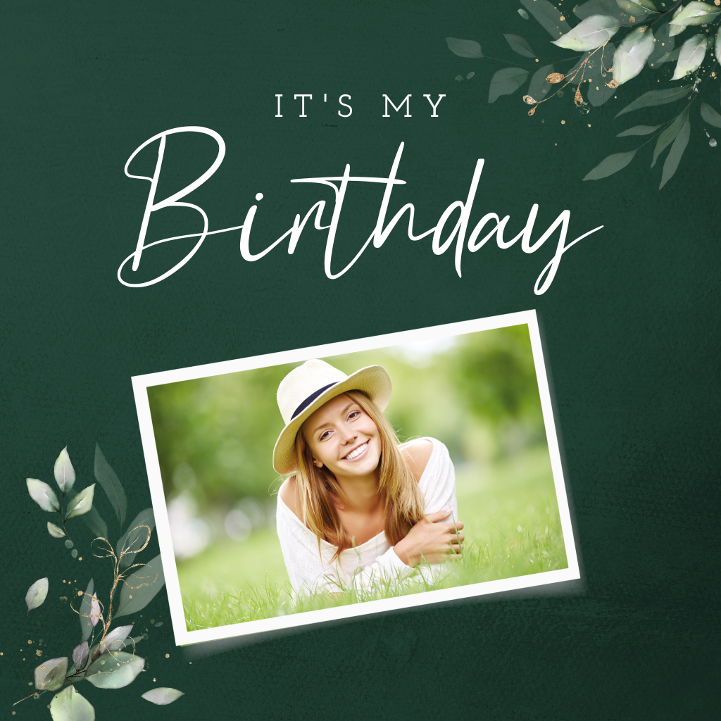 Ben jij binnenkort jarig en wil je je vrienden en familie uitnodigen voor een feestje? Verstuur dit donkergroene kaartje met waterverf bladeren. Een stijlvolle uitnodiging, perfect voor jouw verjaardagsfeest. Pas dit ontwerp eventueel aan.