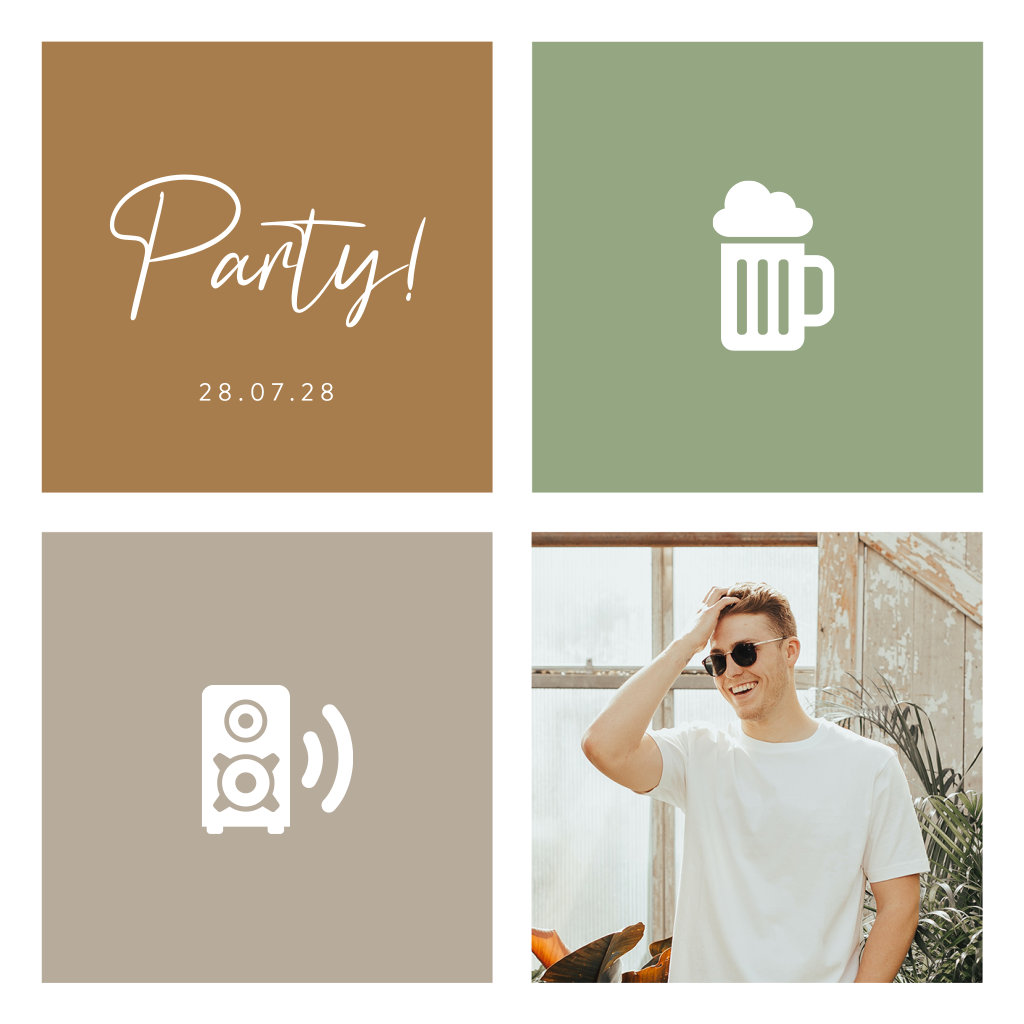 Nodig je vrienden uit voor een feest of borrel met dit grafische ontwerp met hippe gekleurde vlakken en getekende iconen. Voeg een foto van jezelf of de feestlocatie toe voor een persoonlijke finishing touch. De icoontjes, kleuren en lettertypes zijn eenvoudig aan te passen met onze ontwerptool.
