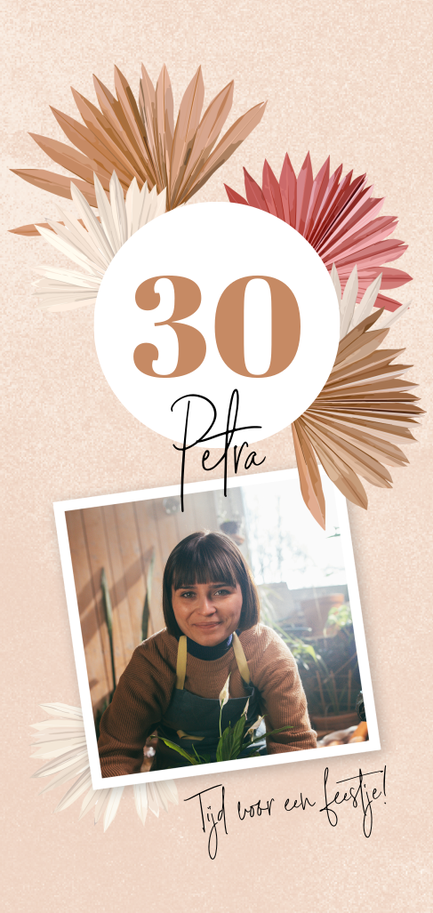 Alvast gefeliciteerd, je bent bijna jarig. Tijd om een feestje te organiseren, daar hoort natuurlijk ook een passende uitnodiging bij. Dit ontwerp heeft een roze achtergrond met vrolijk gekleurde waaiers. Op de kaart staat het jaartal in roze cijfers en een foto van jezelf.