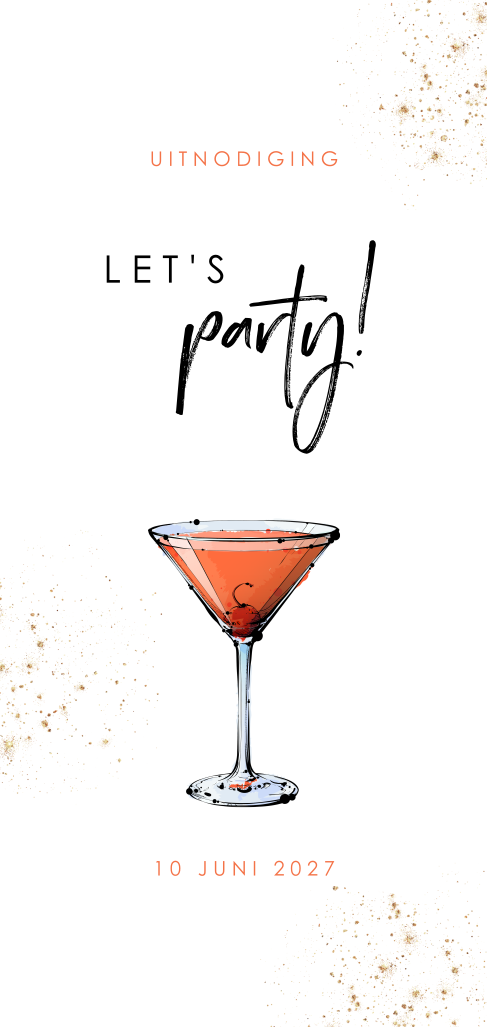 Een feestelijke uitnodiging met illustratie van een cocktail, goudkleurige spetters en speelse typografie. Nodig je vrienden en familie uit voor een feestje of diner met dit leuke ontwerp. Liever een ander lettertype? Pas dit gemakkelijk aan in onze handige ontwerptool.
