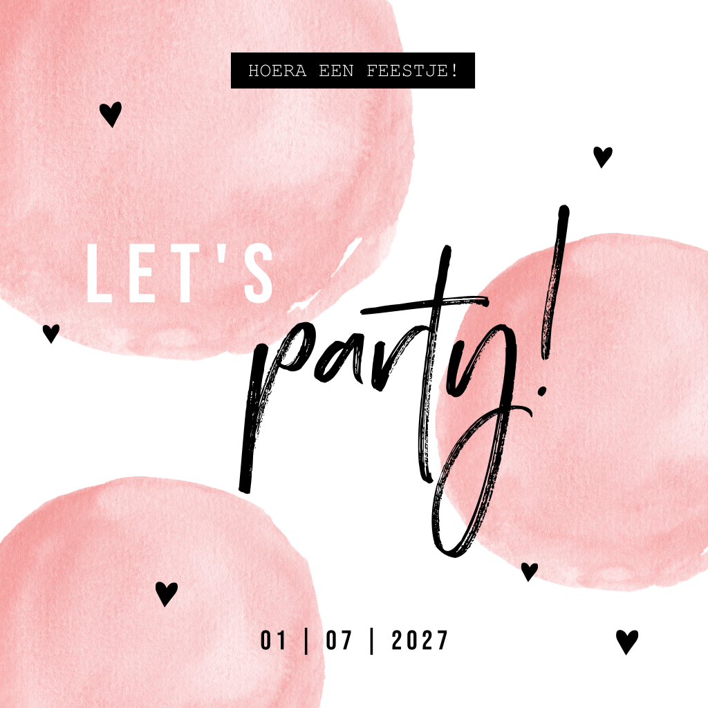 Verjaardagsuitnodiging met roze waterverf en zwarte hartjes. Een vrolijke uitnodiging voor een verjaardag met roze waterverf cirkels, zwarte hartjes en opvallende typografie. Nodig iedereen uit voor je feestje met deze hippe uitnodiging! Pas dit ontwerp eventueel aan in handige ontwerptool.