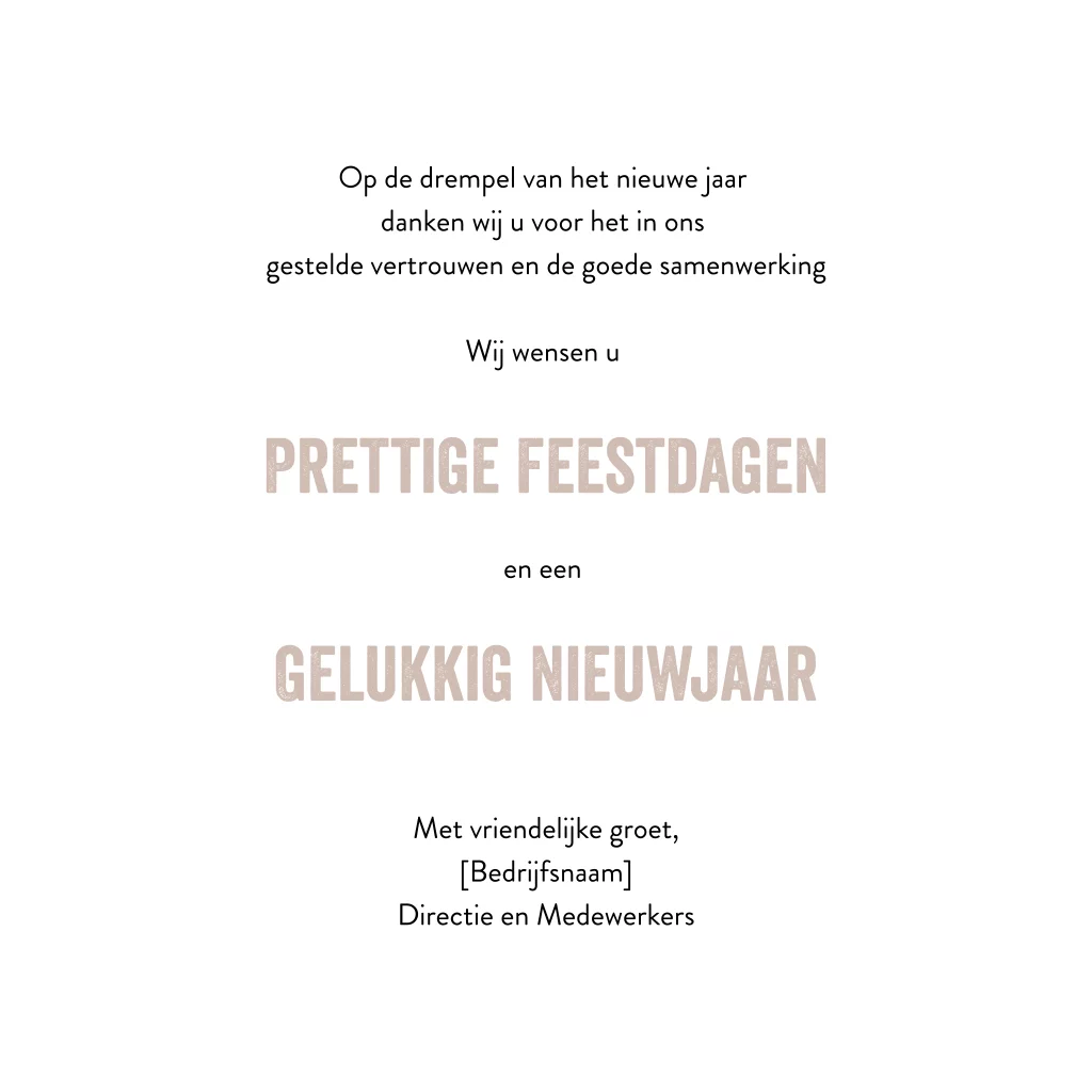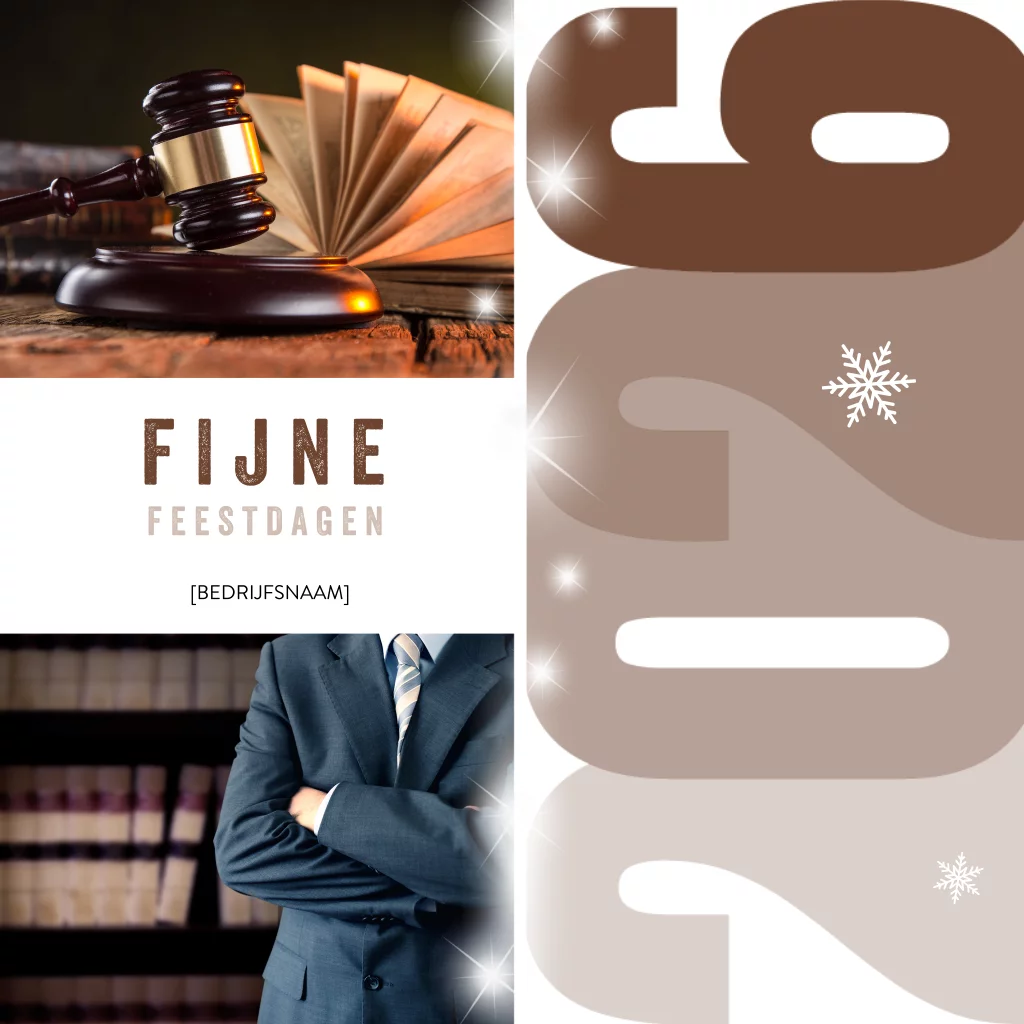 Chique, dubbele kerstkaart met verschillende vlakken en afbeeldingen van de advocatuur. Het jaartal staat met grote, dikke cijfers op de kaart. Links kun je onder 'Fijne Feestdagen' de naam van je bedrijf plaatsen. In het midden van de kaart verspringen witte sterretjes.