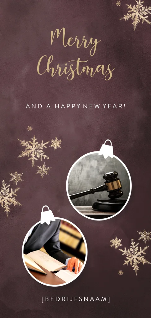 Bent u werkzaam als advocaat? Kies dan voor deze sfeervolle kerstkaart met een dieprode kleur. In de kerstballen is het mogelijk om eigen foto's te plaatsen. Ook staat de bedrijfsnaam op de voorkant. Aan de achterkant kun u uw persoonlijke kerstwens plaatsen voor uw klanten en relaties.