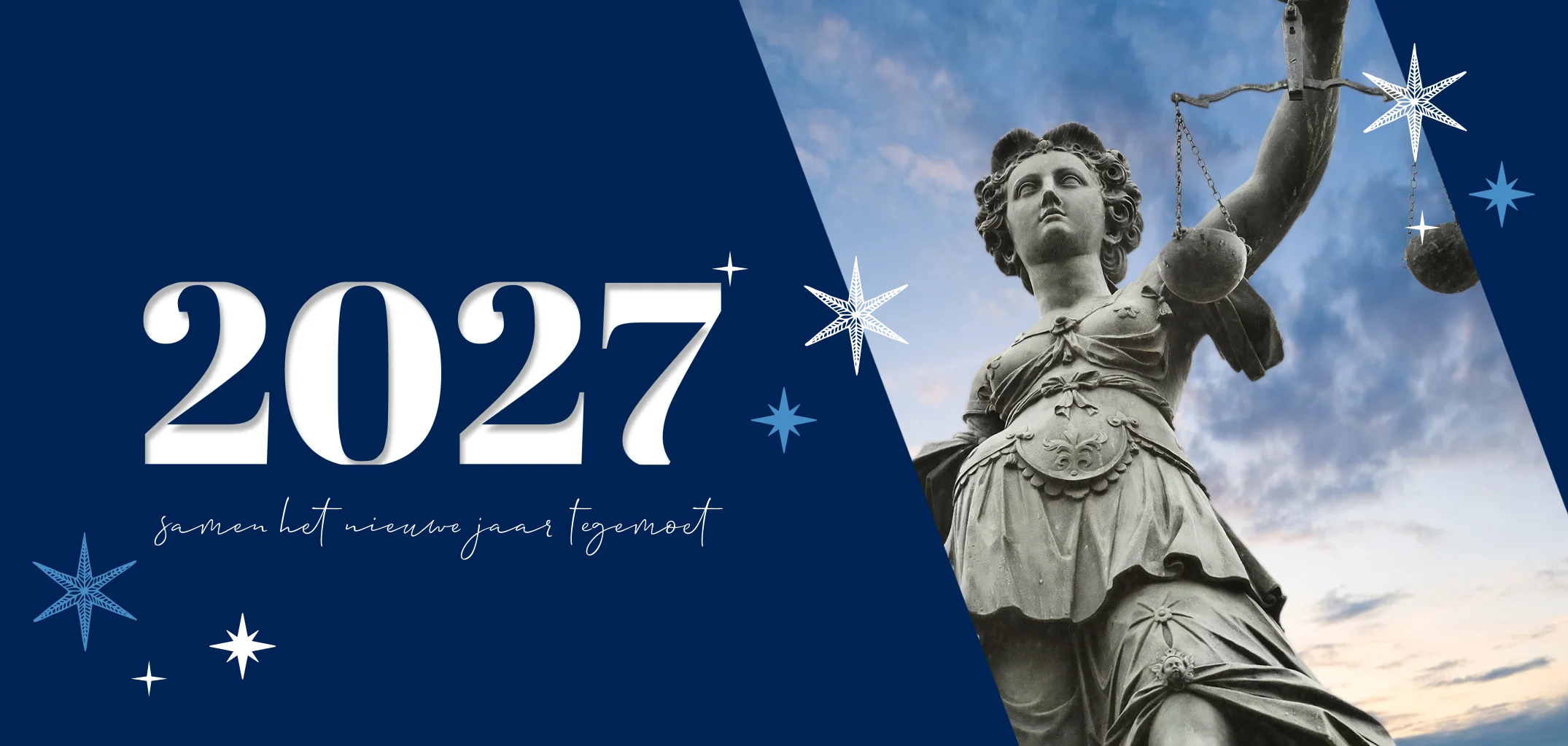 Een mooie zakelijke kerstkaart met een donkerblauwe achtergrond, een foto van een sculptuur van Vrouwe Justitia en goudfolie sterren. Een perfecte kaart wanneer u in de advocatuur werkt en uw zakelijke contacten een goed nieuwjaar wilt toewensen. De goudfolie afwerking maakt dit tot een chique ontwerp.