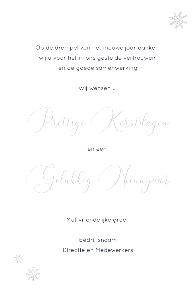 Deze mooie kerstkaart is gemakkelijk te personaliseren. Zo kunt u onder andere onze voorbeeld foto vervangen door een eigen foto, maar ook de lettertypes en kleuren kunnen gewijzigd worden. Op deze manier stuurt u gemakkelijk een gepersonaliseerde kerstkaart naar uw zakenrelaties en klanten.