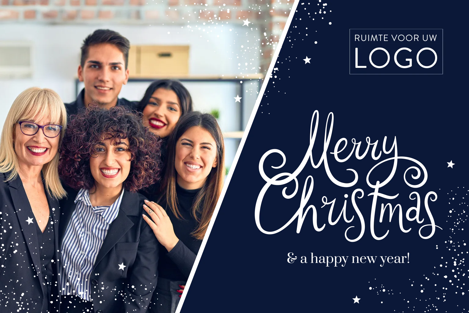 Donkerblauwe foto kerstkaart met goudfolie kerstgroet en bedrijfslogo. Op dit zakelijke ontwerp kun je een eigen foto plaatsen van uw team of bedrijfspand om deze te personaliseren. Ook is er ruimte voor uw logo bovenaan de kaart. De goudfolie tekst en spetters maken dit kaartje tot een feestelijk geheel! Pas deze kerstkaart naar eigen wens aan in onze editor en bestel een proefdruk.