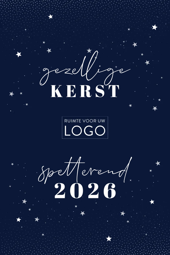 Wens uw zakelijke contacten of werknemers prettige feestdagen toe met deze donkerblauwe kerstkaart met kleine sterretjes en goudfolie typografie. In het midden van de kaart kunt u uw eigen bedrijfslogo plaatsen. U kunt zelf de teksten aanpassen met onze editor.