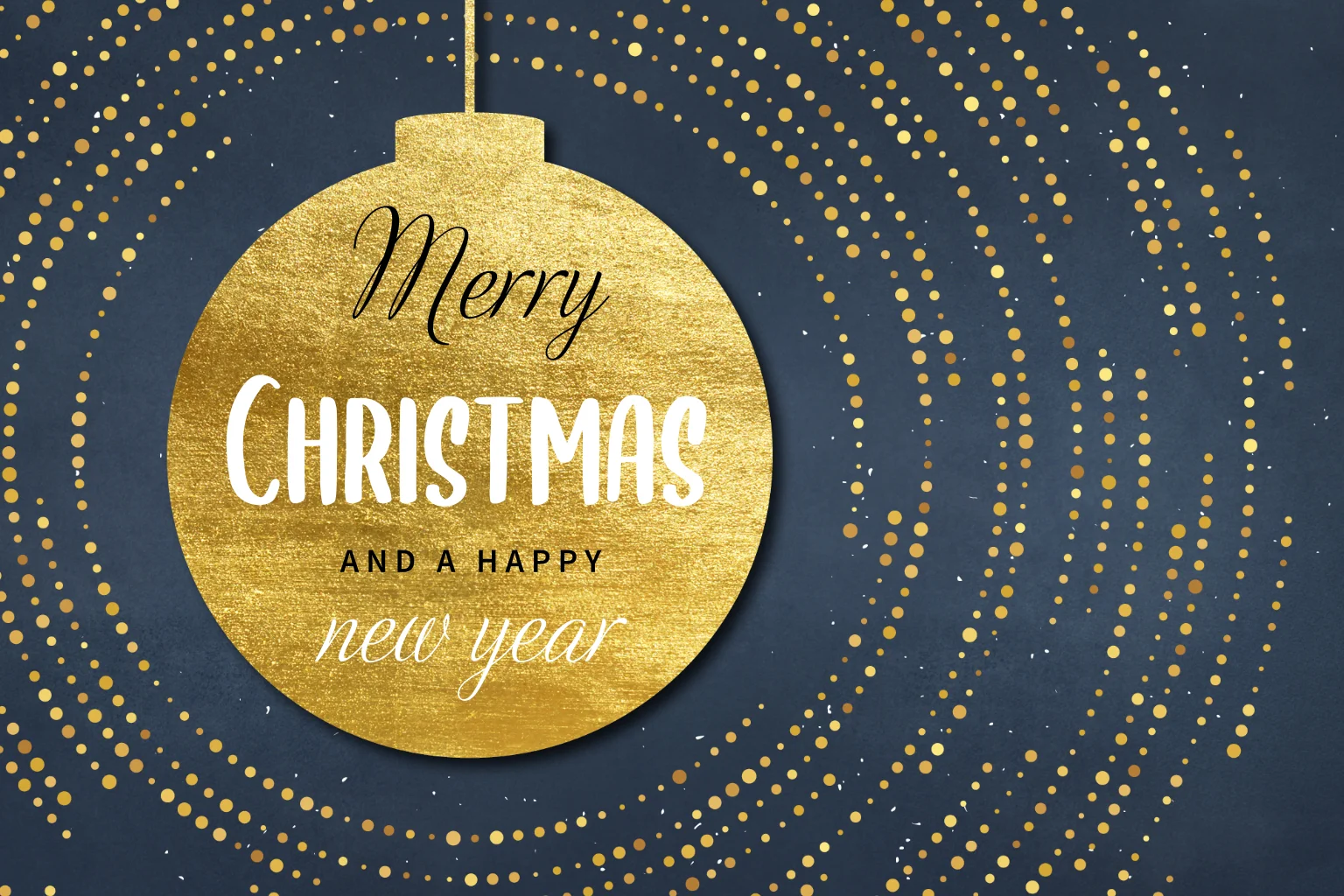 Mooie zakelijke kerstkaart met de donkerblauwe achtergrond, goudkleurige kerstbal met daarin de kerstwens en gouden straling van de kerstbal. De goudkleurige stippen samen met de donkerblauwe achtergrond combineren perfect. Bestel deze sfeervolle kerstkaart om naar je zakenrelaties te sturen. Pas zelf de teksten aan en bestel een proefdruk!