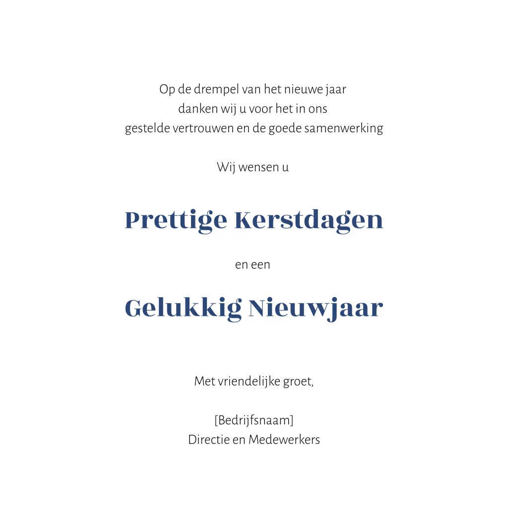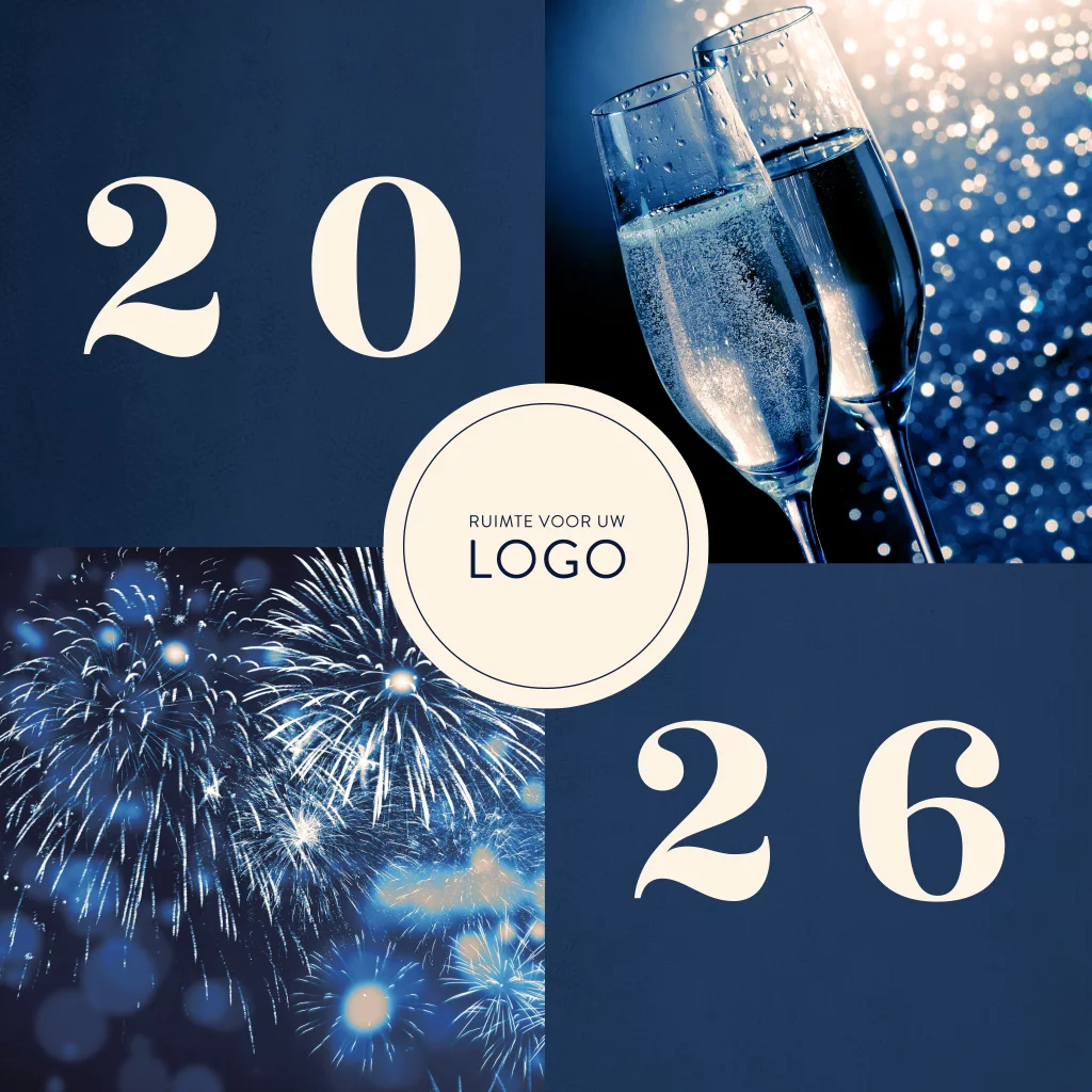 Een feestelijke kerstkaart in donkerblauw. Voorop staan sfeervolle afbeeldingen van vuurwerk en champagne, samen met het jaartal van het aankomende nieuwe jaar. In het midden is ruimte voor uw logo. Deze blauwe kerstkaart biedt een elegante manier om waardering te tonen aan uw zakelijke relaties. Laat zien dat u om uw partners, klanten en medewerkers geeft met een kerstgroet die uw bedrijfsidentiteit in de schijnwerpers zet.
