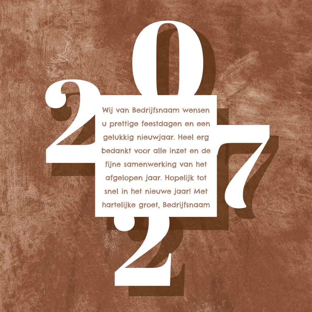 Wens uw medewerkers of zakelijke contacten een fijne kerst en gelukkig nieuwjaar met dit grafische ontwerp. Op een bruine achtergrond staat een opvallend jaartal en kader met een kerstgroet. Aan de binnenkant kunt je nog eigen tekst kwijt en is er ruimte voor bijvoorbeeld uw bedrijfslogo. Pas dit ontwerp zelf aan in onze ontwerptool.