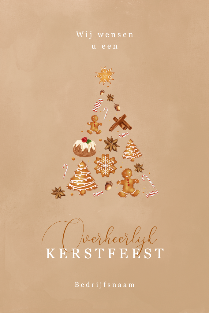 Wens uw medewerkers, klanten of andere zakelijke relaties een overheerlijk kerstfeest met dit leuke kerstkaartje in bruine tinten. Op de voorzijde staat een kerstboom, gemaakt van allerlei koekjes en gebak. Perfect voor een banketbakker, taartenshop of supermarkt. Pas deze kerstkaart zelf aan en bestel een proefdruk om deze in het echt te kunnen bewonderen.