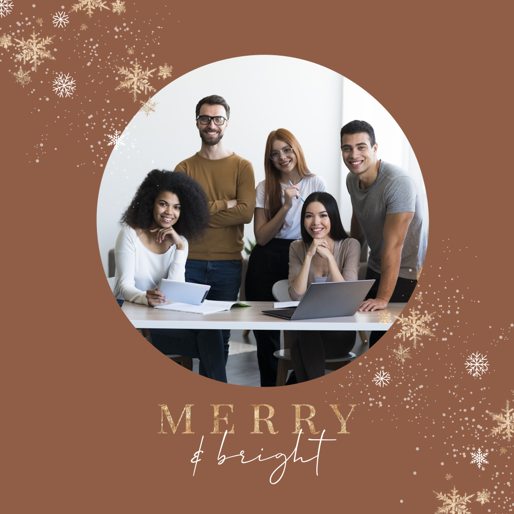 Een bruine kerstkaart met rond fotokader en goudlook sneeuwvlokken. Een trendy kerstkaart om uw zakelijke contacten een prettig nieuwjaar mee toe te wensen. Voeg een foto van uw eigen team toe om deze kaart te personaliseren.