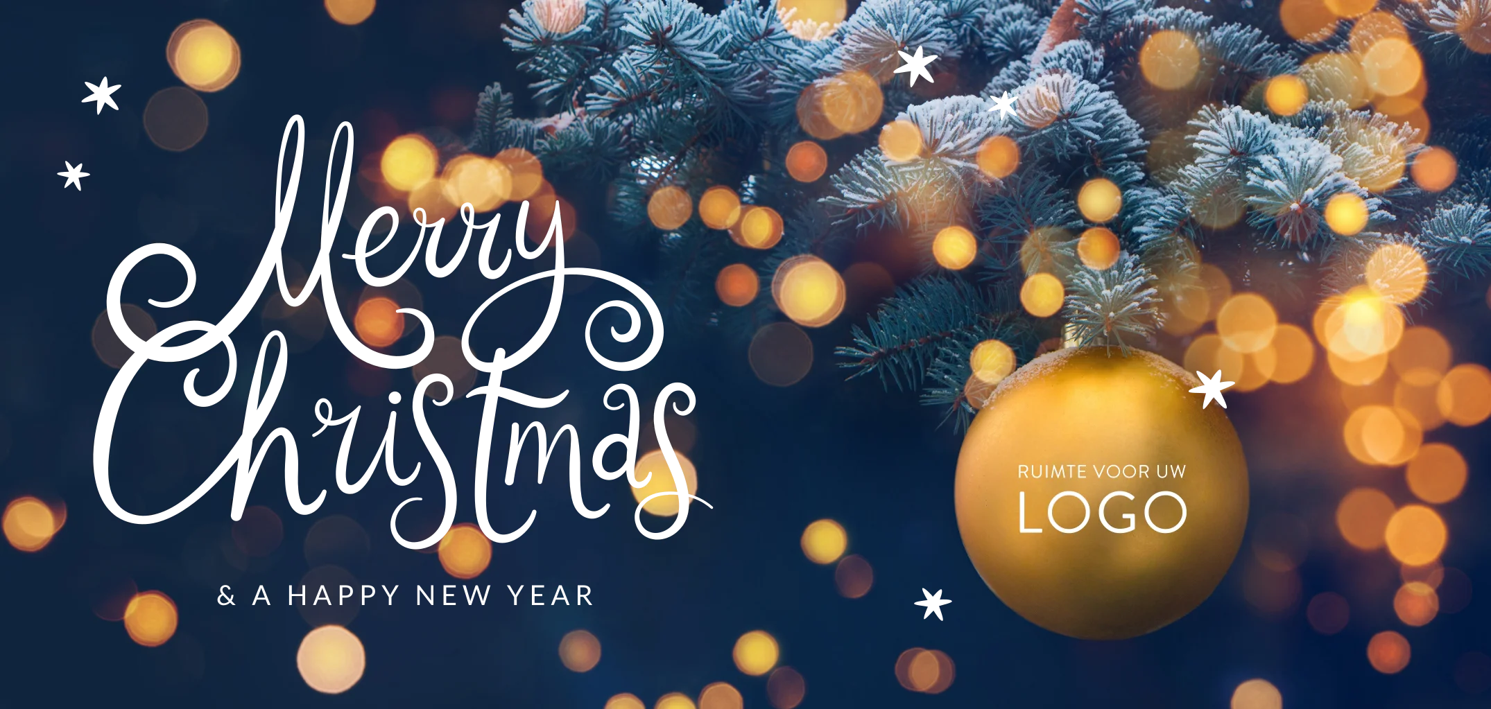 Stuur uw zakelijke kerstgroet in stijl met deze luxe kerstkaart, voorzien van een sfeervolle dennenboom en een elegante kerstbal met ruimte voor uw logo. De goudfolie details en de tekst 'Merry Christmas & A Happy New Year' zorgen voor een warme, feestelijke uitstraling, perfect om uw professionele relaties het beste te wensen voor de feestdagen en het nieuwe jaar.