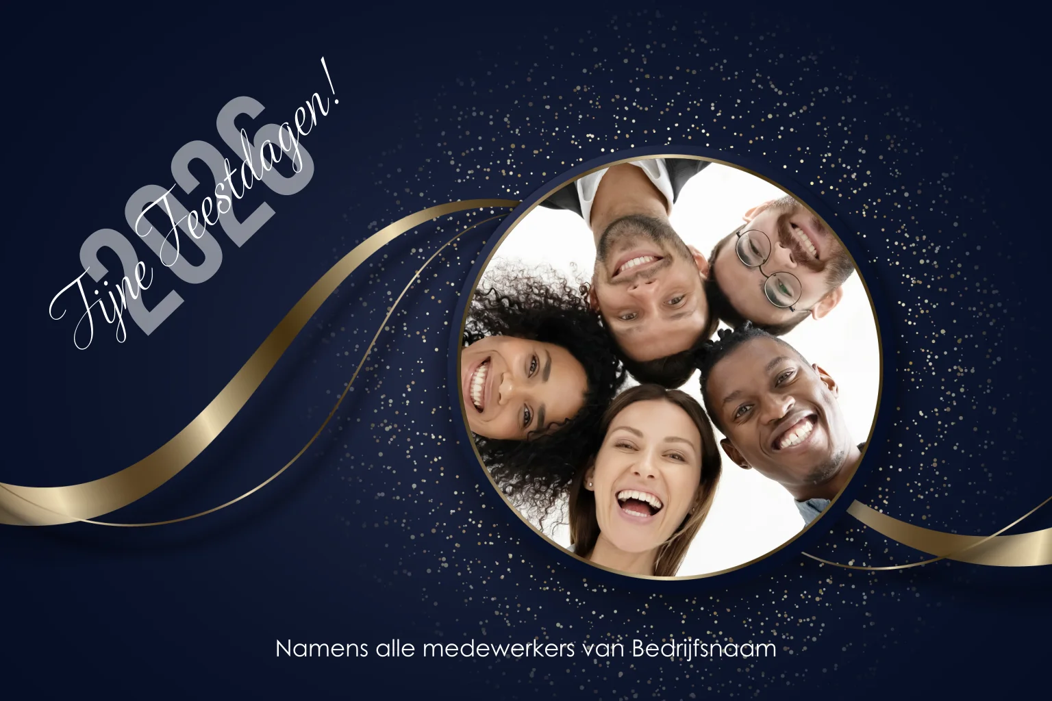 Chique kerstkaart met goudkleurige golven en ronde foto
