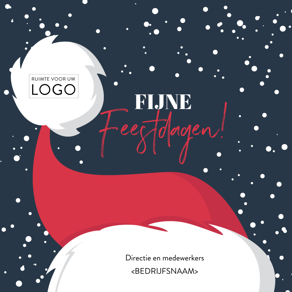 Donkerblauwe kerstkaart met kerstmuts en logo
