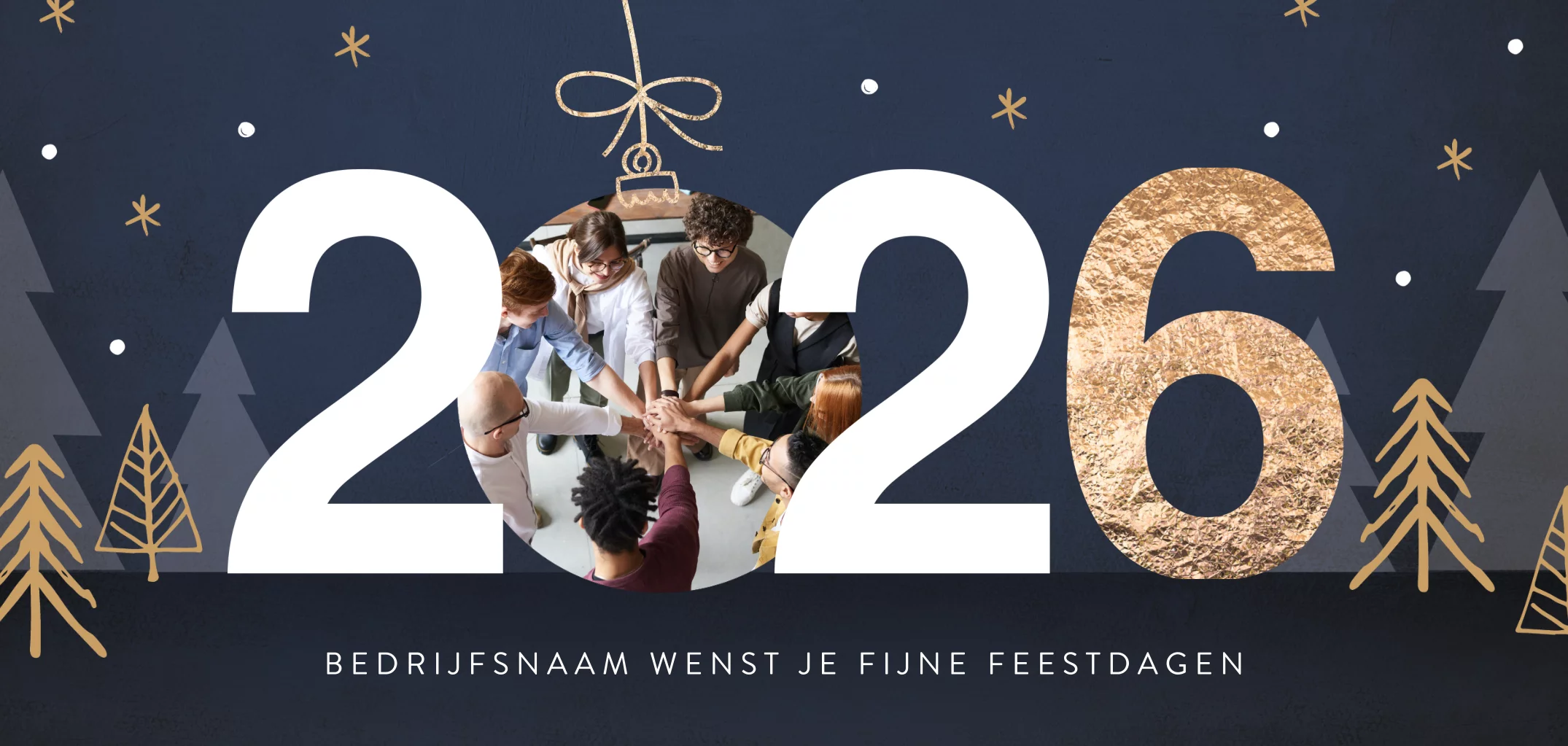 Donkerblauwe kerstkaart met een groot 2026 en eigen foto. Stuur dit jaar naar al uw zakenrelaties en medewerkers een stijlvolle kerstkaart. Dit ontwerp heeft een donkerblauwe achtergrond kleur en groot 2026 in het midden. In het jaartal kan je een eigen foto plaatsen. Het ontwerp aanpassen gaat gemakkelijk via onze ontwerptool.