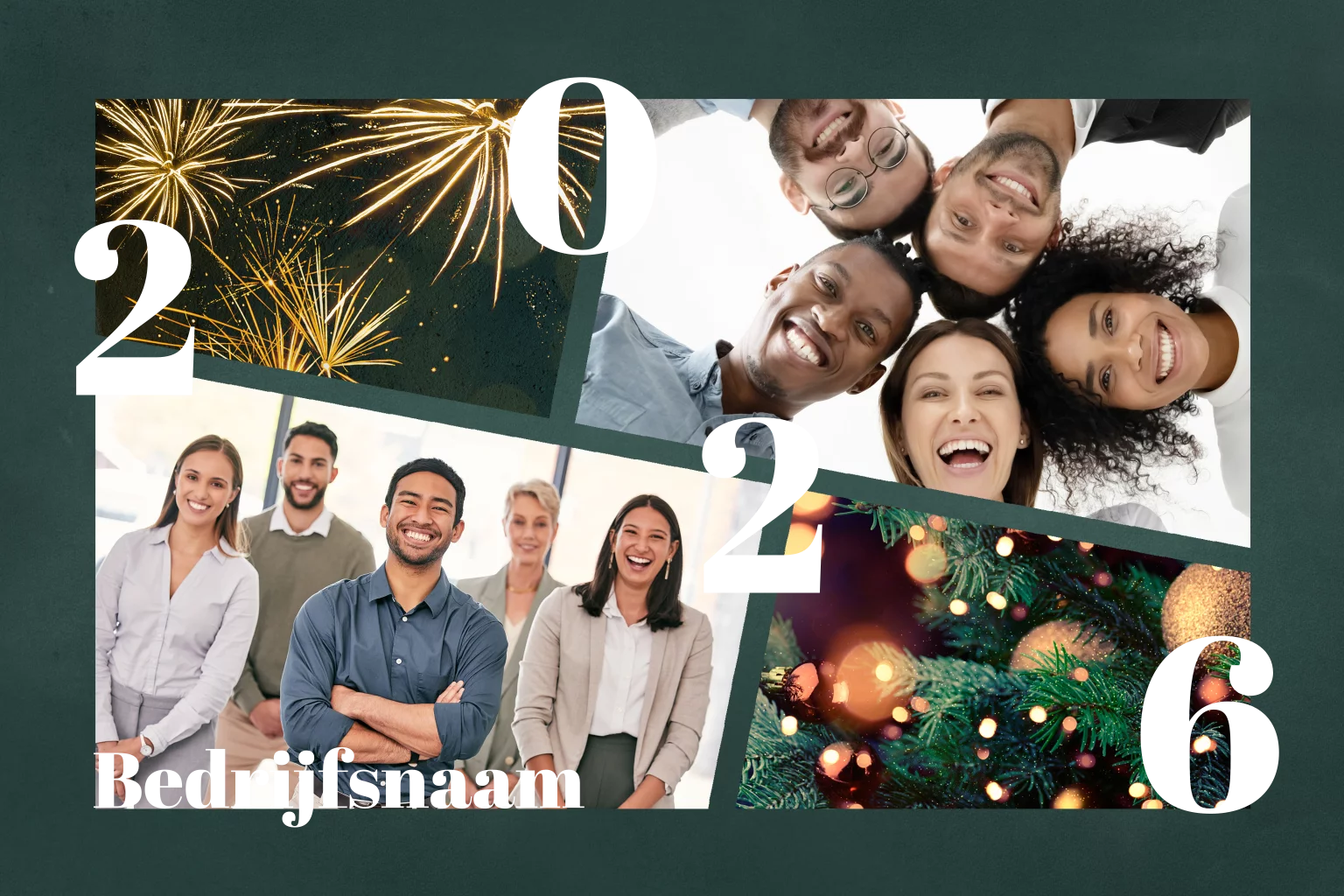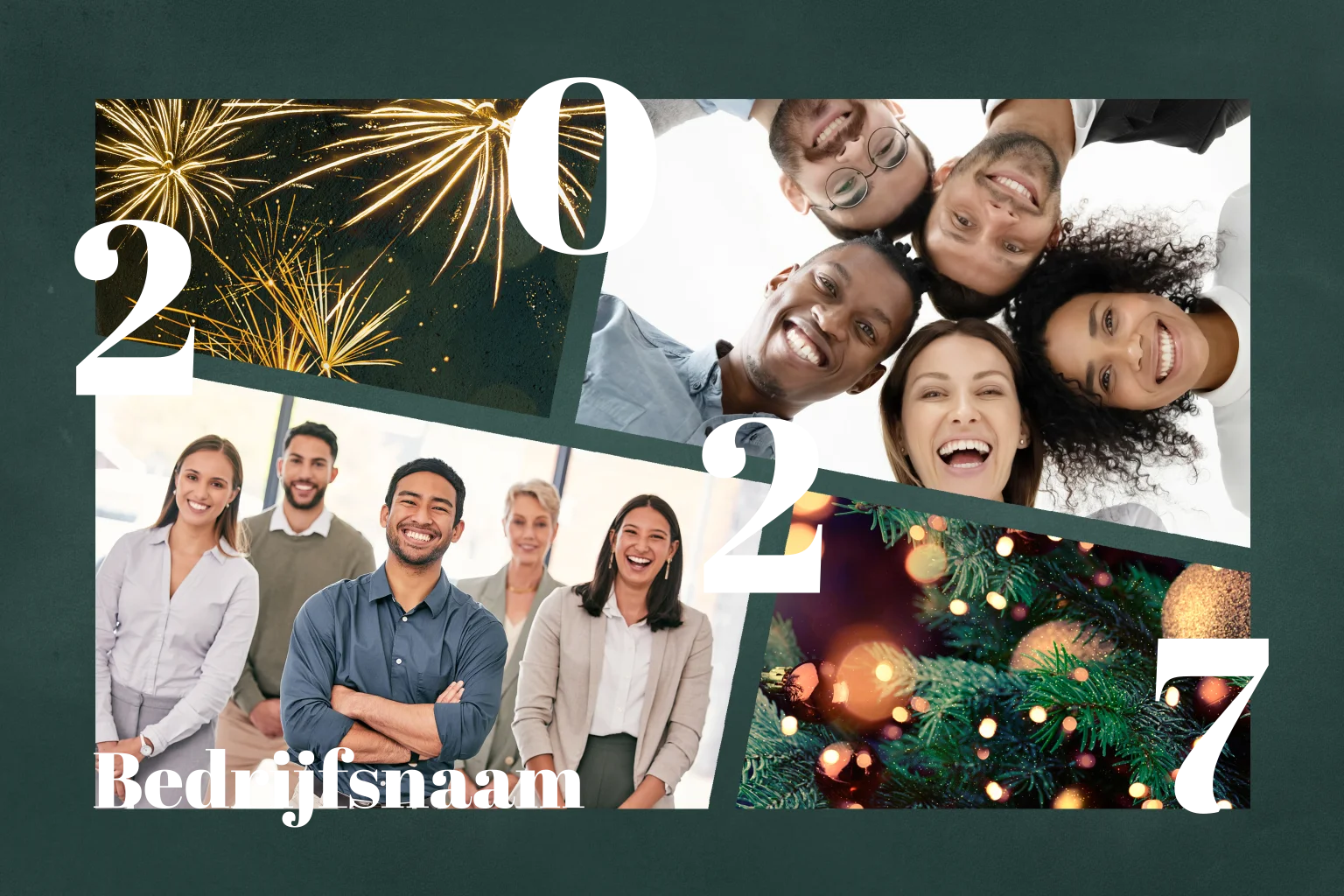 Een feestelijke, zakelijke kerstkaart om al uw contacten een prettige kerst mee toe te wensen. Op de voorzijde staan donkergroene fotokaders waarin u eigen foto's kunt plaatsen van uw team, bedrijfspand of product. De rest van de kaart wordt versierd met goudfolie jaartal, spetters en sfeervolle foto's van vuurwerk en een kerstboom. Pas de lettertypes en kleuren naar wens aan en bestel een drukproef.