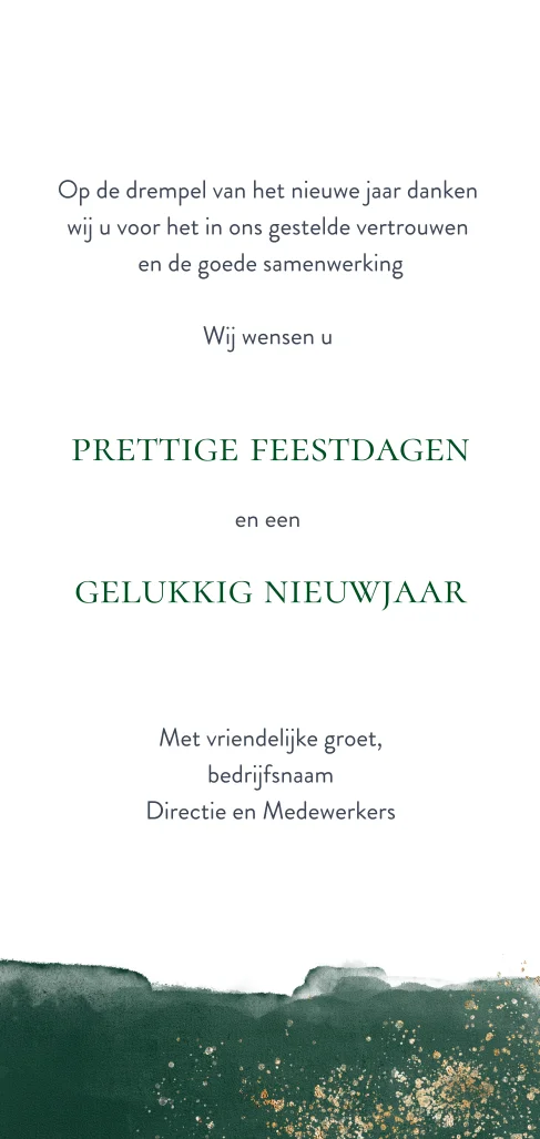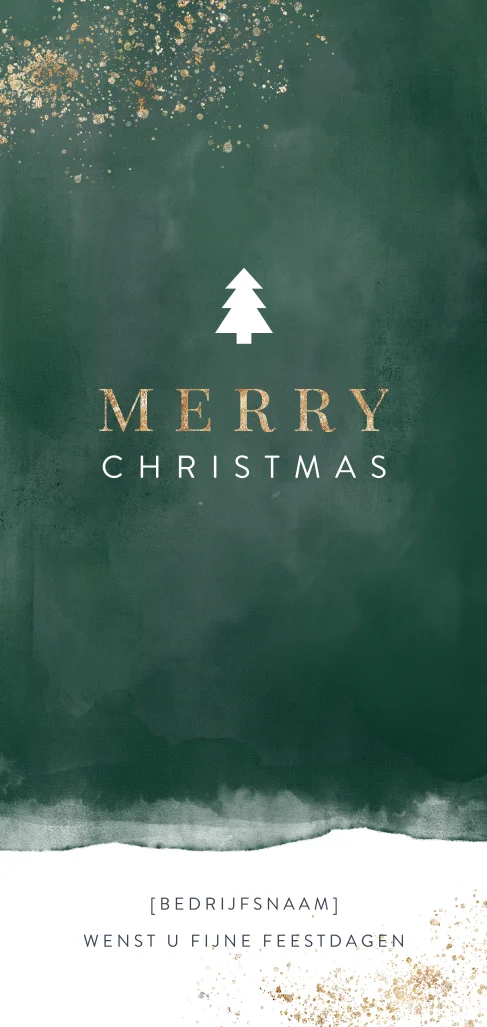 Donkergroene waterverf kerstkaart met witte kerstboom en gouden spetters. Mooie zakelijke kerstkaart met chique uitstraling. De kaart heeft een achtergrond van donkergroene waterverf. Met goudkleurige typografie staat er 'Merry Christmas'. De gouden spetters en de witte kerstboom maken de kaart helemaal af.