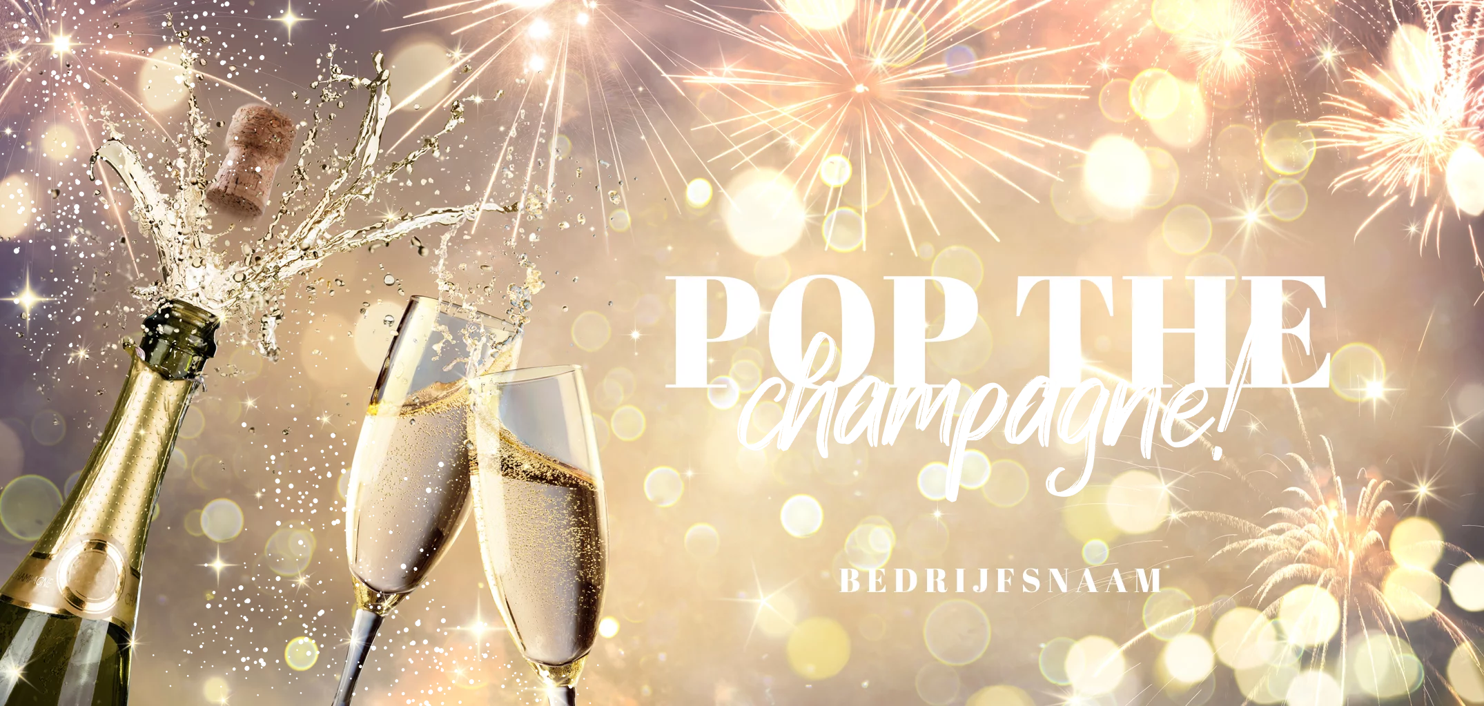 Feestelijke en chique nieuwjaarskaart met spetterend vuurwerk, fonkelende lichtjes en champagne! Op de voorzijde staat groot 'Pop the champagne!', waarbij een deel in glimmend goudfolie gedrukt wordt. Wens uw zakelijke contacten een gelukkig nieuwjaar met deze luxe kaart.