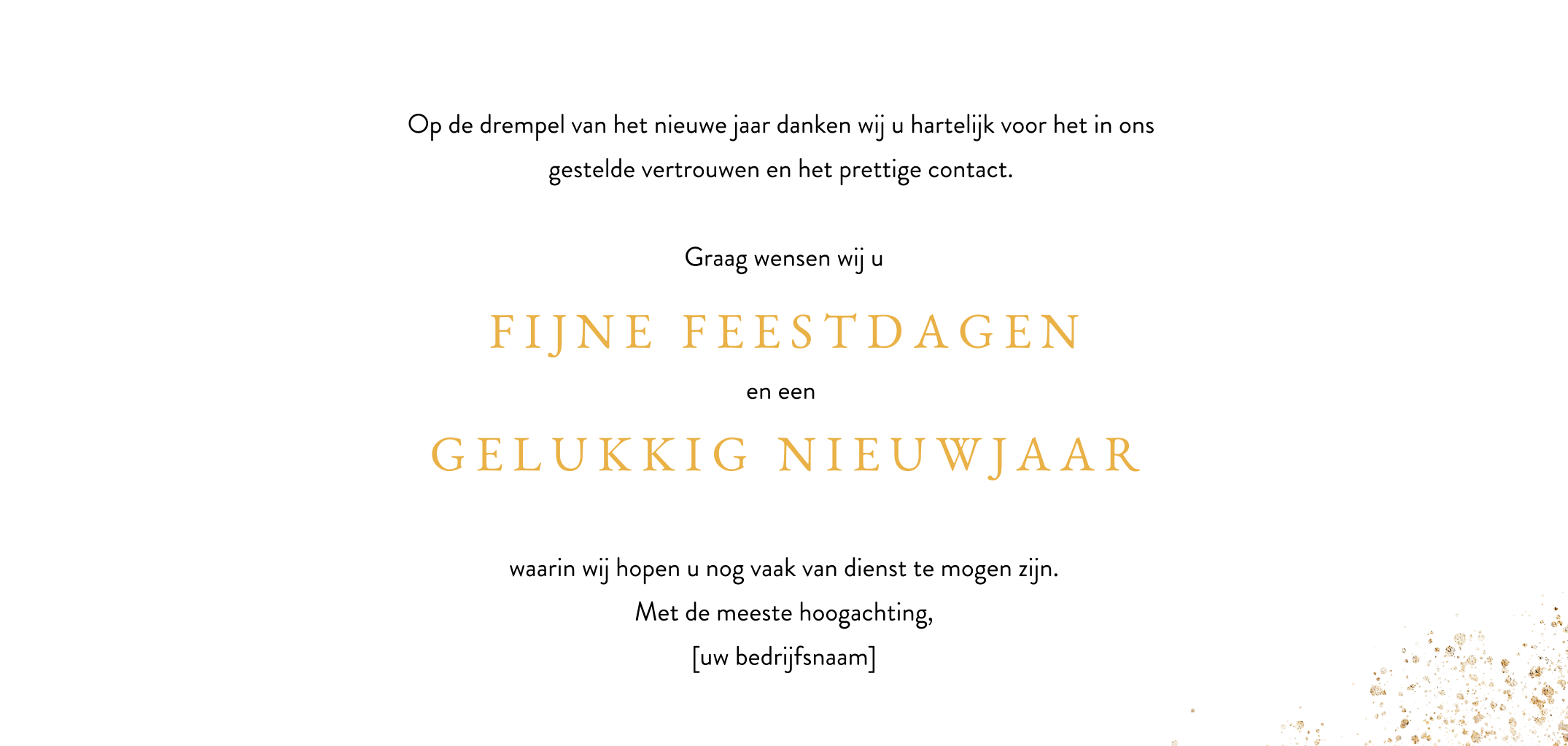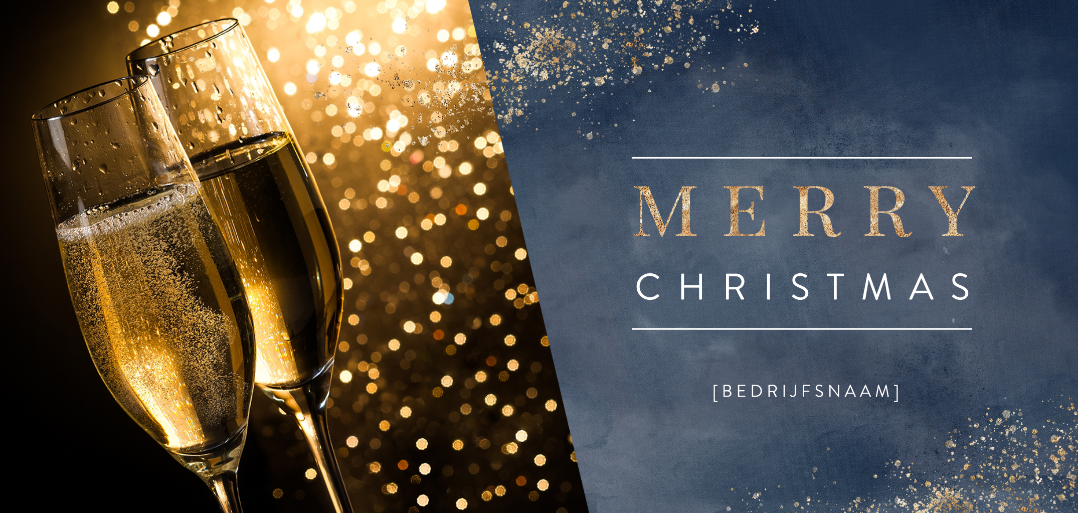 Panorama kerstkaart met ruimte voor een eigen foto of je kunt onze voorbeeldfoto met champagne gebruiken. De strakke typografie maakt het ontwerp af. Pas de kerstkaart naar wens aan en bestel een proefdruk. Dit ontwerp is in meerdere kleuren verkrijgbaar.