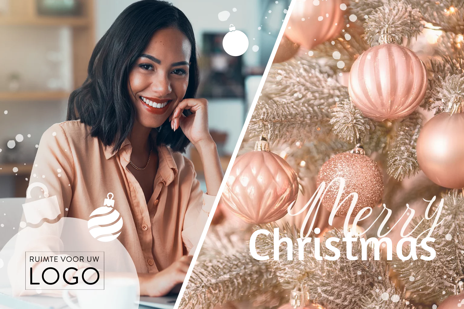 Sfeervolle kerstkaart in zachtroze tinten, met eigen foto en bedrijfslogo voor een persoonlijk tintje. Plaats uw eigen foto (of van uw team of bedrijfspand) in het fotokader op de voorzijde. Zo wenst u al uw zakelijke contacten op een unieke manier fijne feestdagen toe. De roségoudfolie typografie en kerstballen maken dit kaartje op een chique manier af. De mooie foto van zachtroze kerstballen in een roségouden kerstboom zorgt voor een feestelijk tintje. Bestel een proefdruk om deze kaart in het echt te kunnen bewonderen.