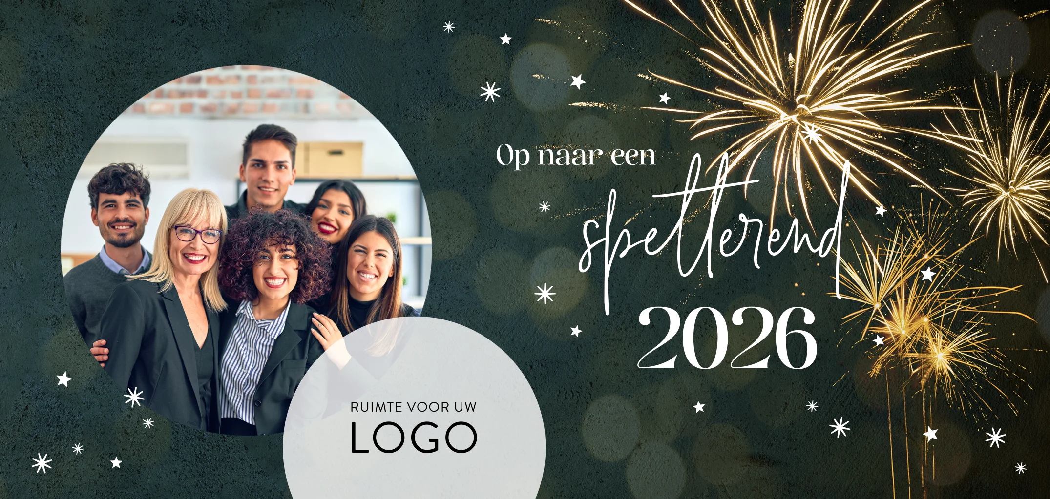Wens uw zakelijke contacten, klanten of team een spetterend nieuwjaar met deze donkergroene kerstkaart met eigen foto, bedrijfslogo en goudfolie. Feestelijk vuurwerk spettert op de achtergrond van deze mooie nieuwjaarskaart met persoonlijk tintje. Voeg een eigen foto en bedrijfslogo toe om deze kaart te personaliseren. Aan de binnenzijde is een
