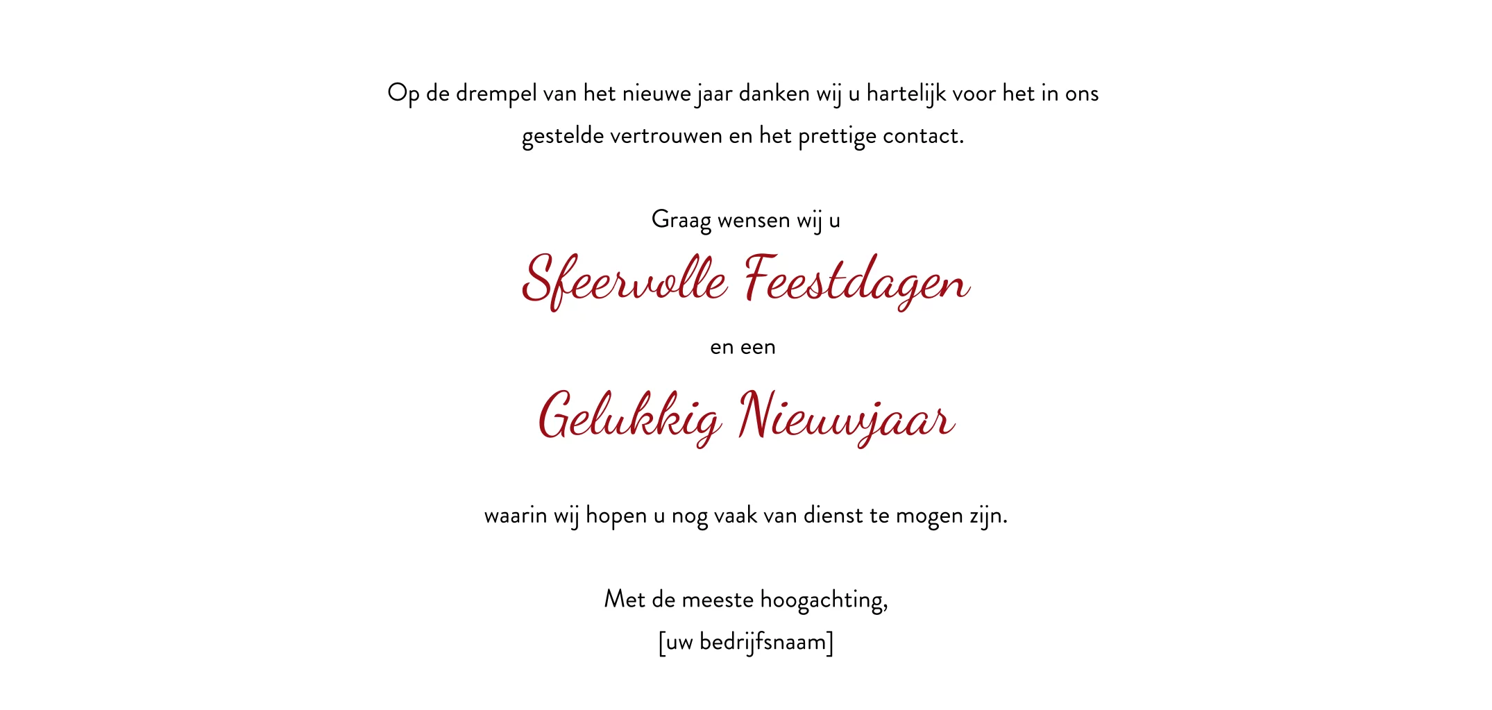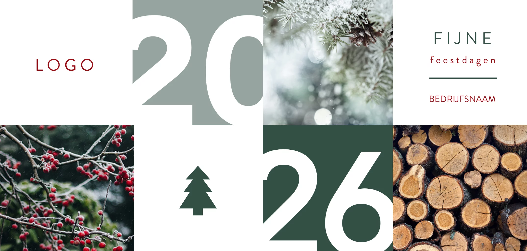 Op zoek naar een strakke kerstkaart om naar al uw werknemers of zakenrelaties te sturen? Wat dacht u van dit stijlvolle ontwerp met acht grafische vlakken en diverse kerstfoto's. De kaart is extra versierd met een illustratie van een kerstboom en een kerstster. Op de voorzijde is ruimte voor uw logo.
