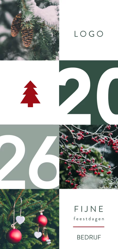 Langwerpige kerstkaart waarbij de voorzijde is verdeeld in acht vlakken. Hierin staan verschillende elementen zoals diverse kerst foto's met dennenappels, kerstbesjes en rode kerstballen. Rechtsonderin kunt u uw bedrijfsnaam of logo plaatsen. Pas de kaart naar wens aan.