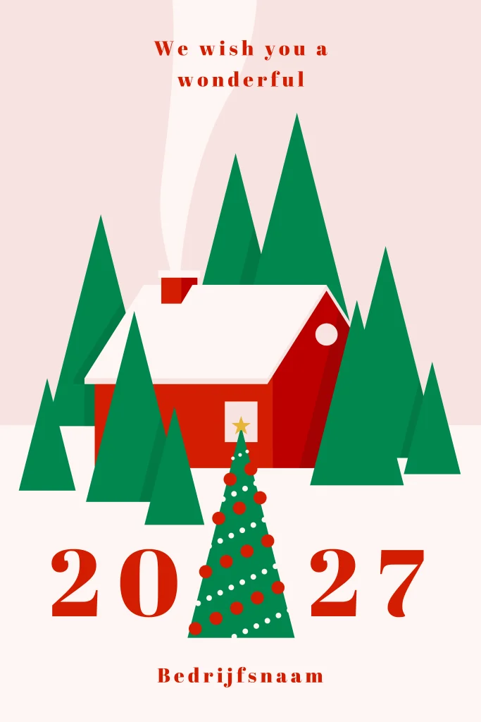 Grafische en vrolijke kerstkaart met huisje in de sneeuw. Op zoek naar een trendy en opvallende kerstgroet voor uw zakelijke klanten? Ga voor dit enkele kaartje met kleurrijke afbeelding in roze, groen en rood. Naast de grafische kerstboom staat het jaartal. Onderaan kunt u uw bedrijfsnaam plaatsen om deze kaart te personaliseren.